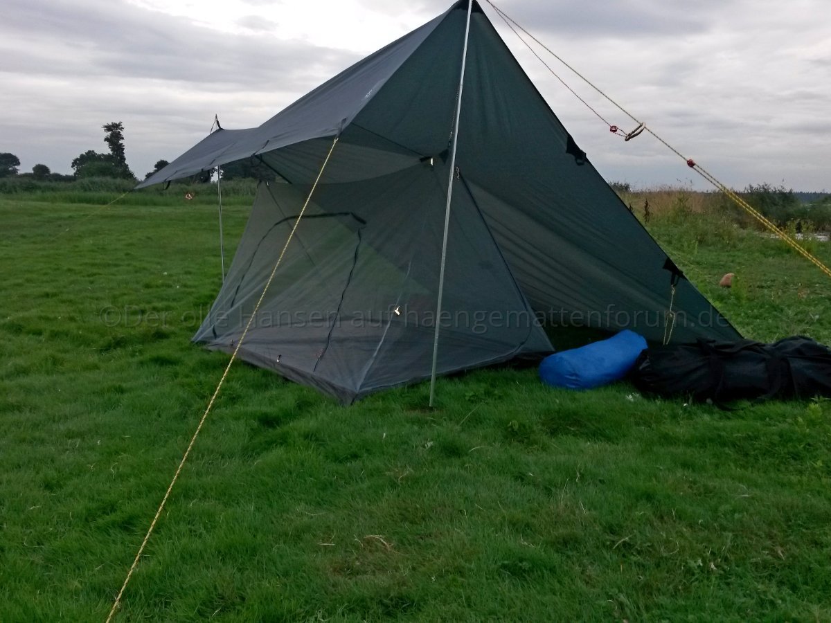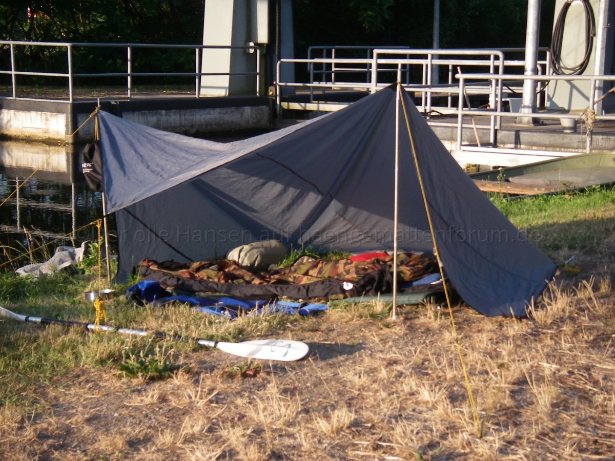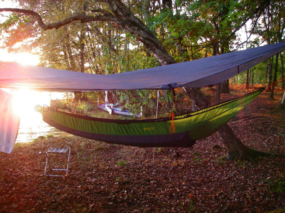 Wer nur mit Hängematte und Tarp unterwegs ist, tut gut daran, die unterschiedlichen Konstruktionsmöglichkeiten des Tarps auszuprobieren ("Tarptent"), falls man doch mal auf dem Boden schlafen muss.