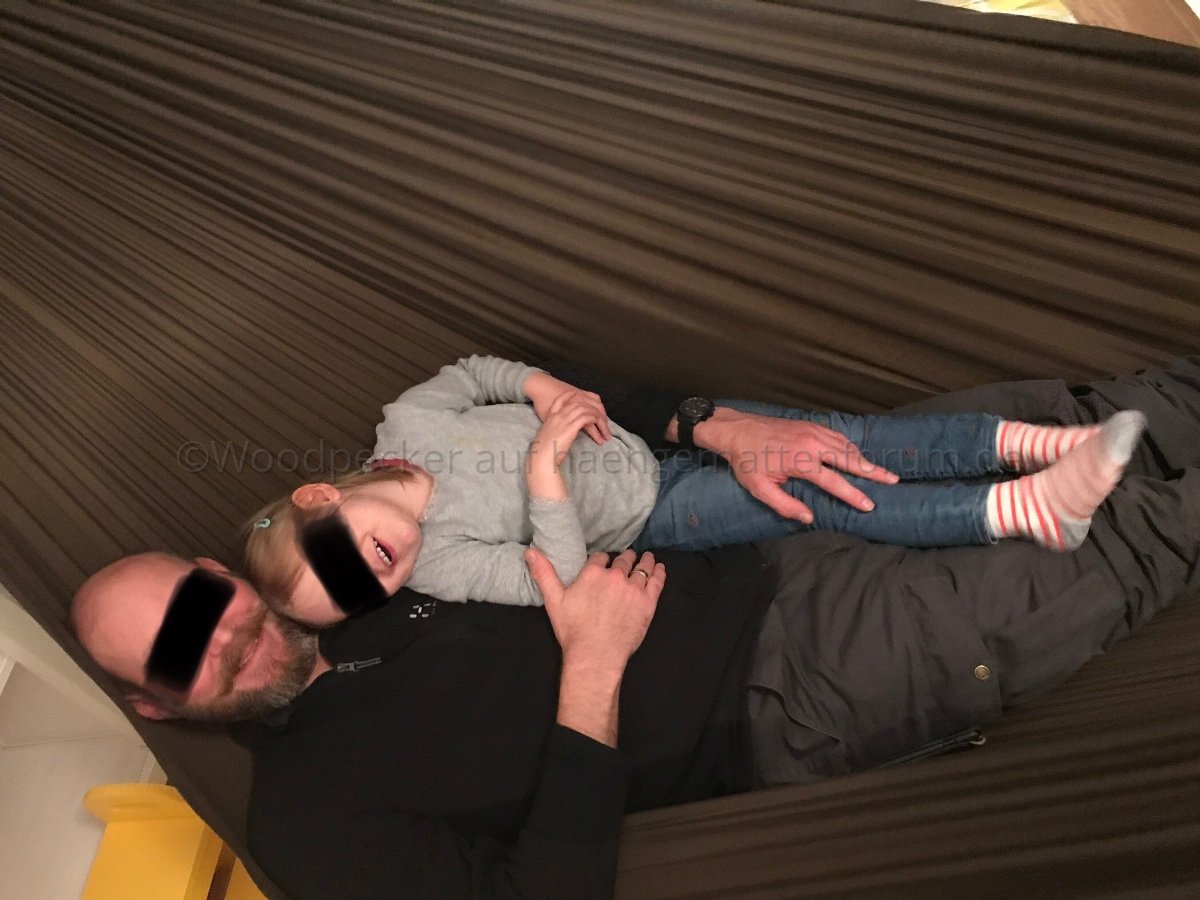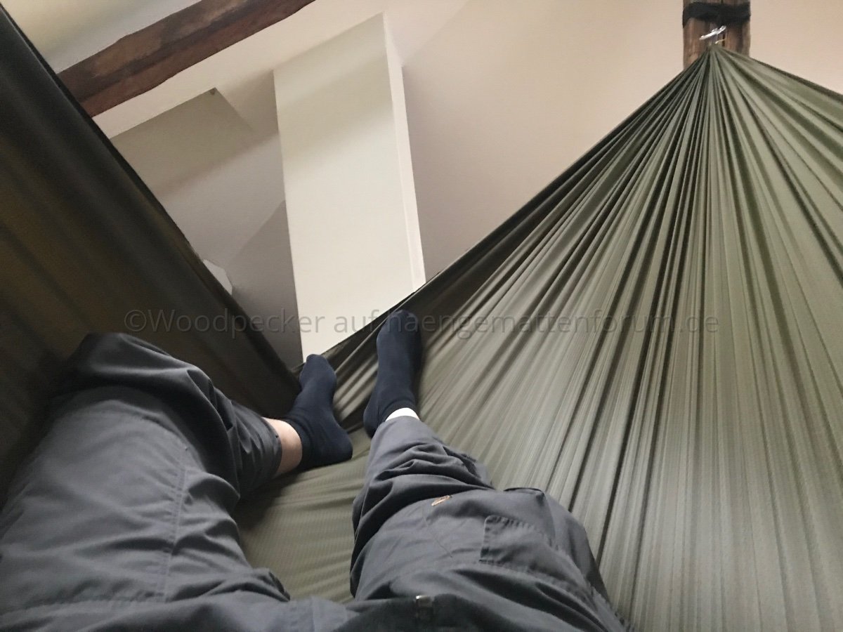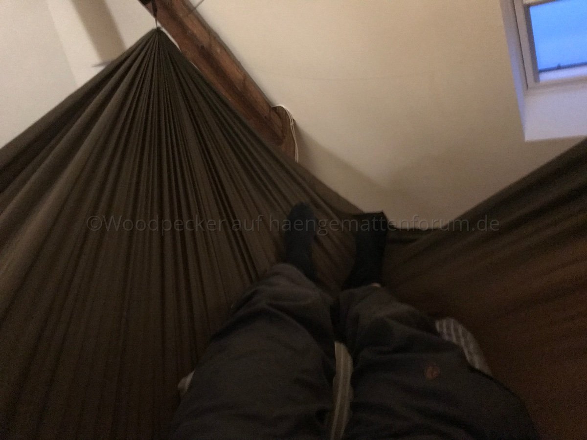 Nun habe ich hier ein 3,50x3,50 DD Tarp in camo und die Hängematte habe ich heute fertig genäht. Sie ist 1,61m lang und 1,75m breit geworden, besteht aus Hexon wide 1.7 (vielen Dank Alissa) und ist an Tunneln aufgehängt. Probehalber habe ich sie in der kürze der Zeit die mir heute zur Verfügung stand an zwei Balken aufgehängt und erstmalig probegelegen. Fast schon perfekt. Sie hat noch keine Ridgeline und der Winkel hat noch nich gepasst, sodass sie ganz am Rand ein wenig „schlaff“ war. Ich bin aber zuversichtlich, dass das ein sehr geniales Teil wird, sofern die Aufhängungsparameter passen.