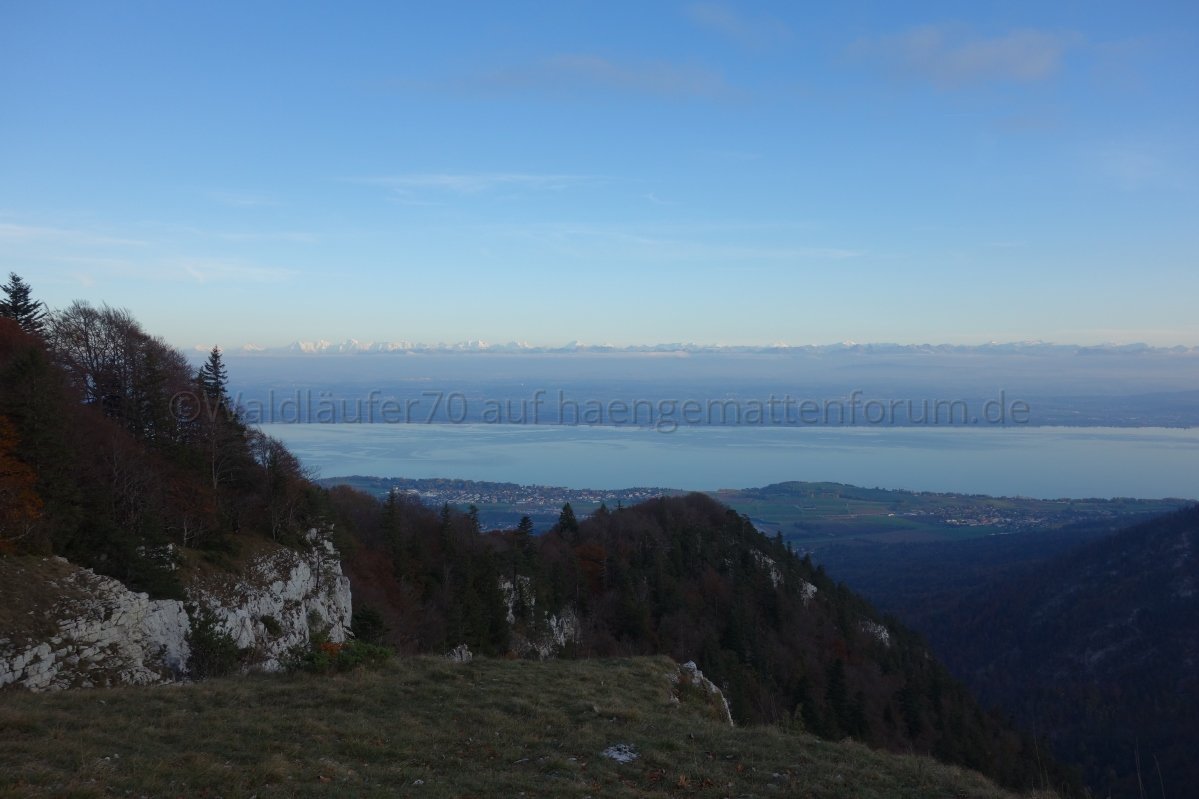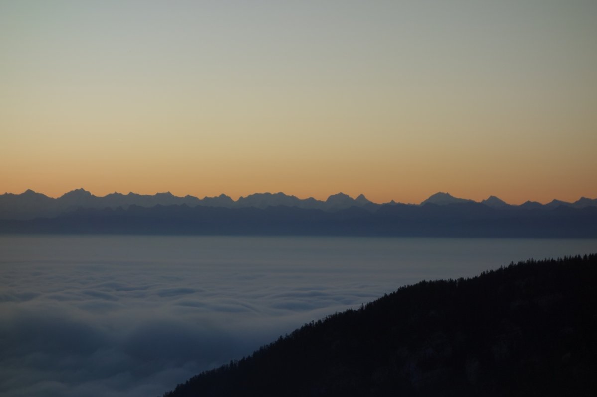 Die Krete hatte ich noch vor Einsetzen der Dämmerung erreicht und konnte den Blick übers Mittelland auf den Neuenburgersee und in die Alpen geniessen: