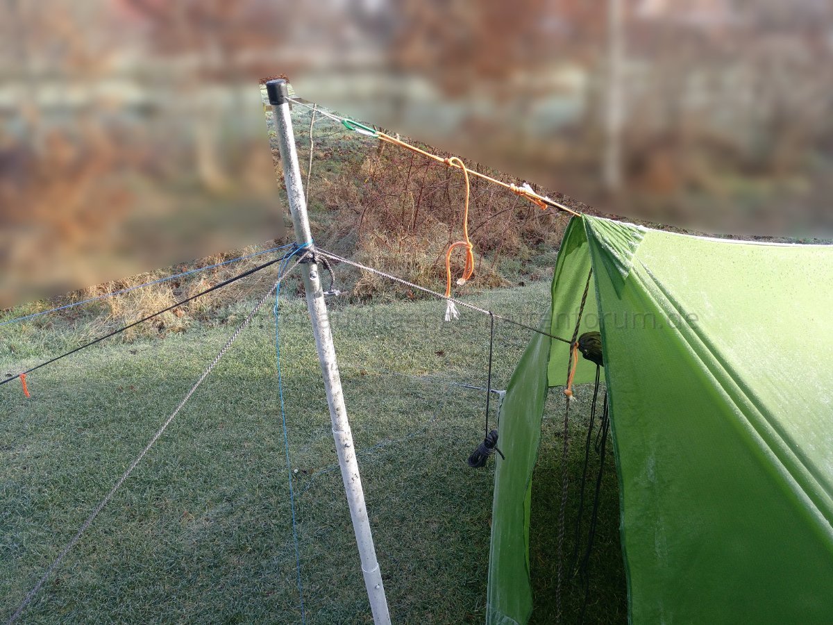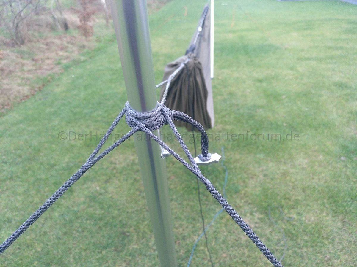 Die Stangen selbst machen einen guten Eindruck. Die Verarbeitung ist sehr ordentlich und sie biegen sich trotz >90kg Zuladung nicht durch. Erstaunlicherweise sinken sie auch kaum im (weichen) Boden ein, das hatte ich eigentlich erwartet. Lediglich die Liegehöhe ist gewöhnungsbedürftig gering. Mit einer eher straff aufgehangenen Chameleon waren es nur noch etwa 30cm zum Boden. Ich konnte aber mein Cumulus Selva 600 ohne Probleme anbringen ohne den Boden zu berühren. Außerdem ist die Höhe für die HM-Aufhängung vorgegeben und kann nicht einseitig verändert werden. Die erhöhte Aufhängung für Tarps sind simpel, aber sehr funktional. Da gab es keine Probleme.