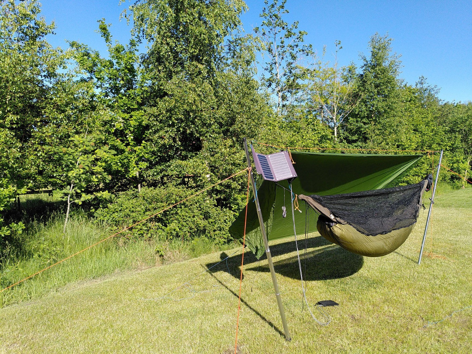 Muss mir nur noch Schlaufen bauen, damit ich die Hängematte als erstes abbauen kann. Die aktuellen Whoopie Slings müsste ich nach oben über die Stangen ausfädeln, was mit montierter Ridgeline aber nicht geht. Bei gutem Wetter kein Problem, bei Regen wäre das ziemlich mies.
