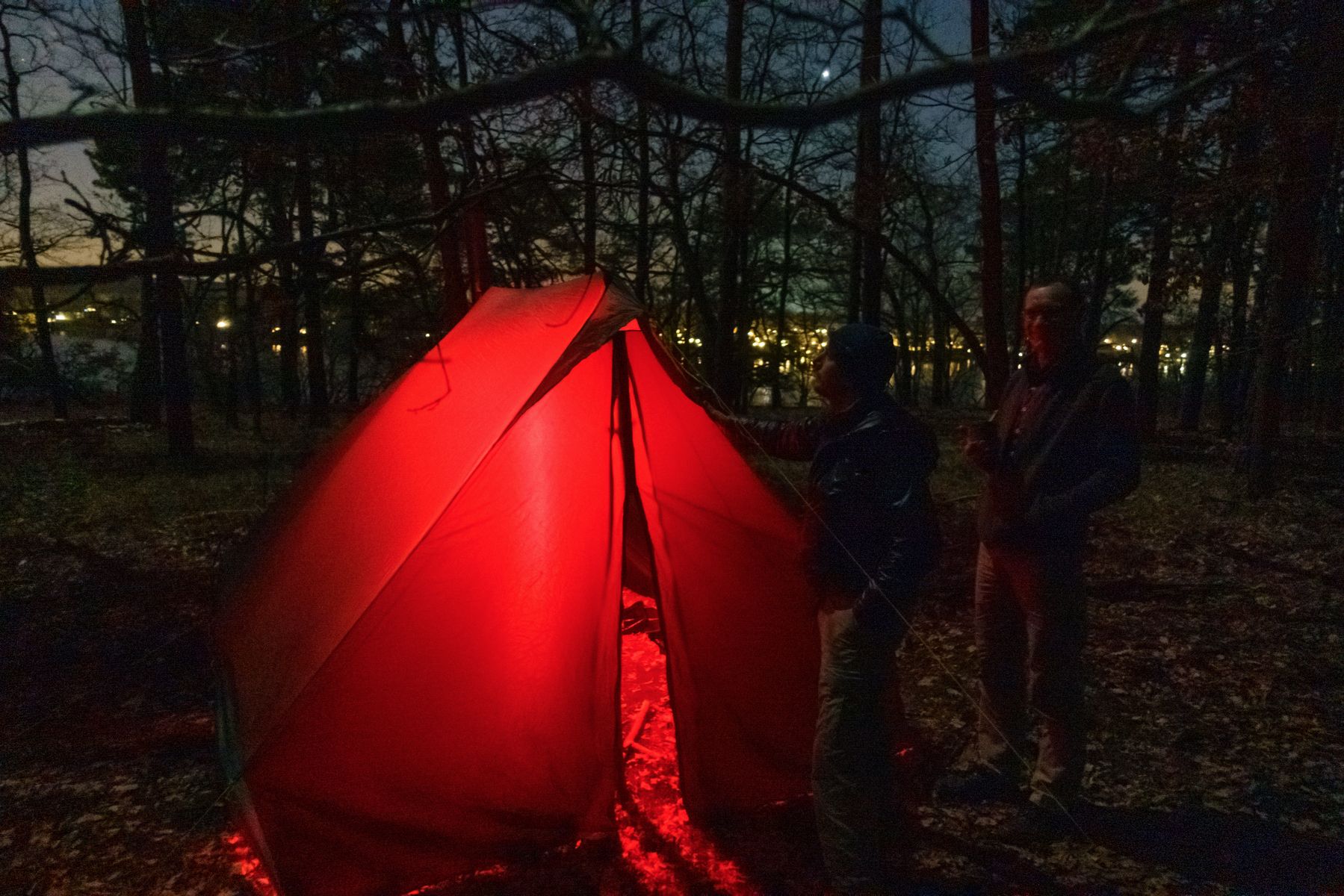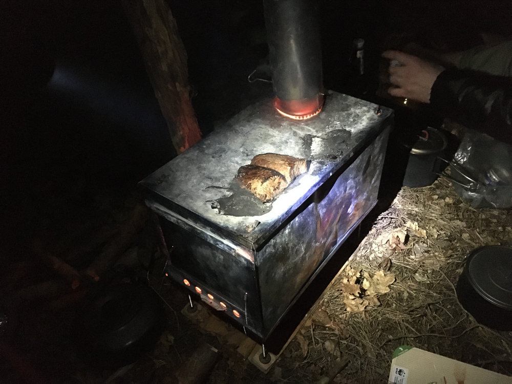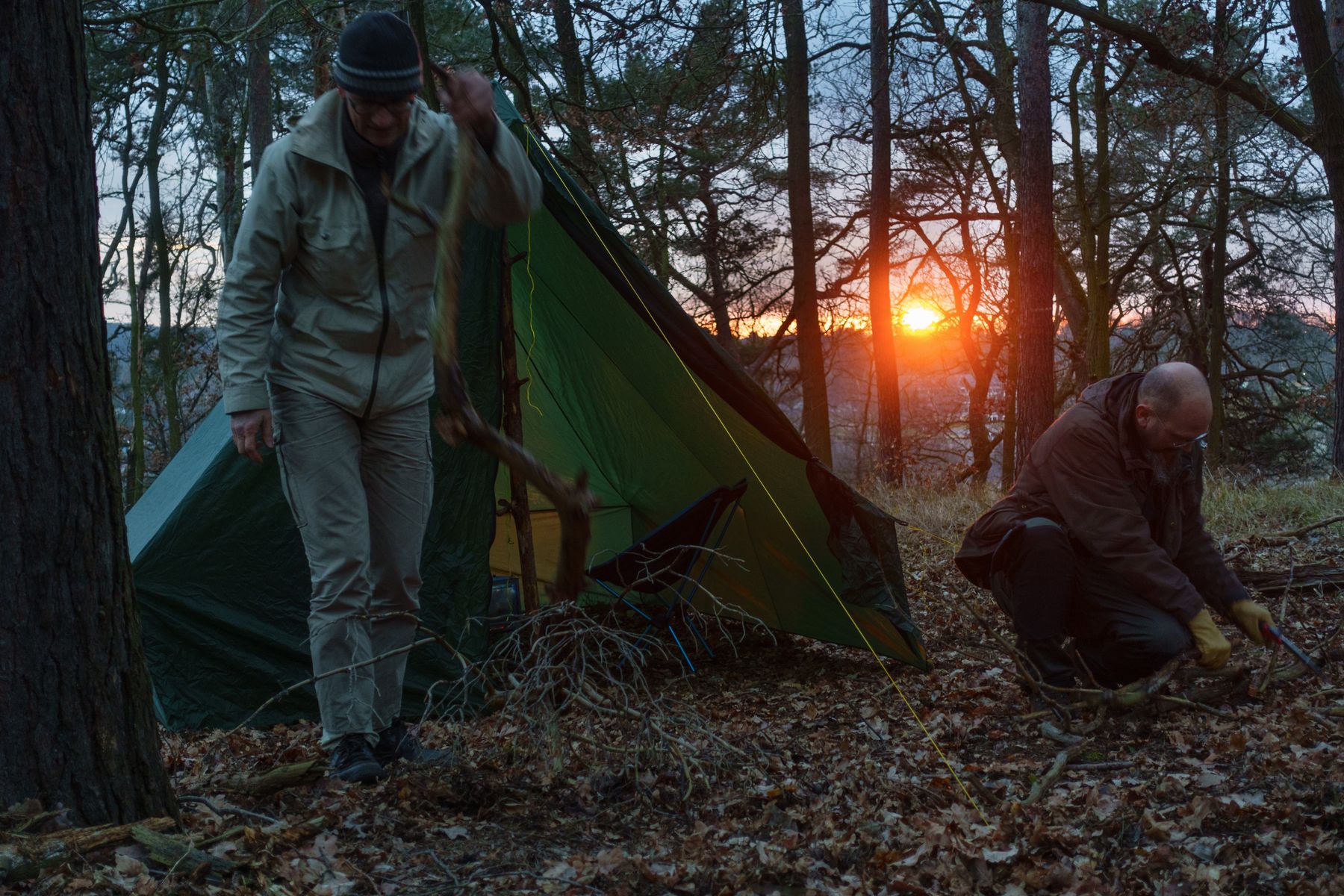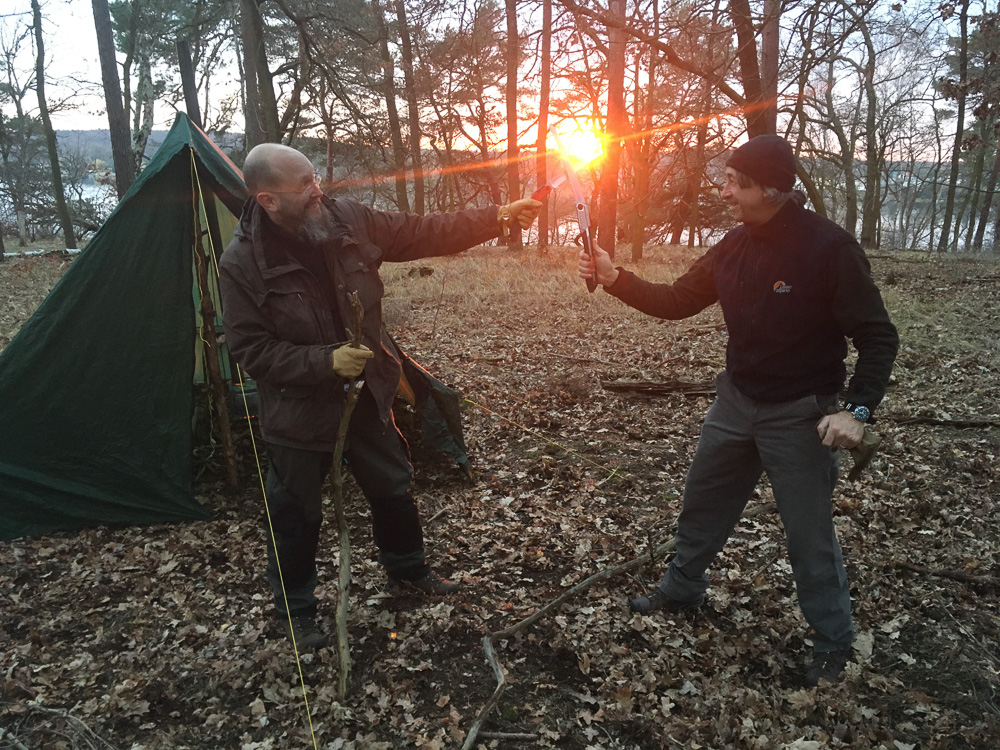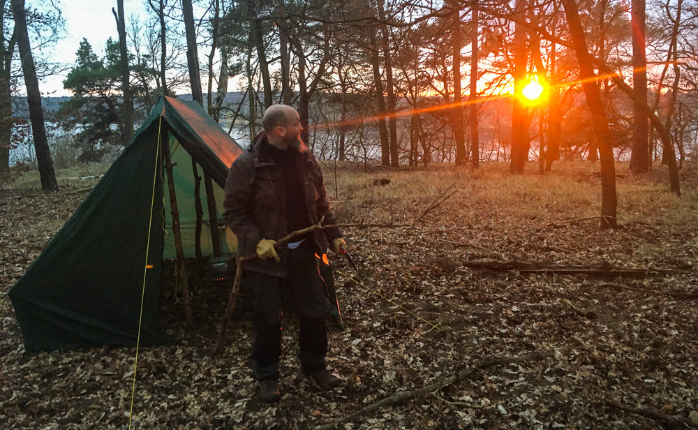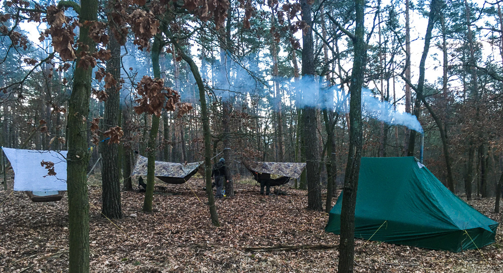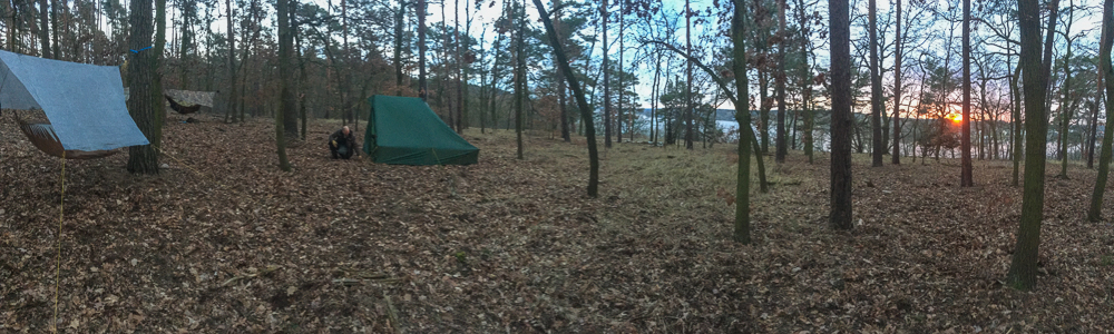 Noch bevor es dämmerte war das Zelt aufgebaut und der Ofen in Betrieb genommen. Die Tarps hätten wir uns eigentlich sparen können.
