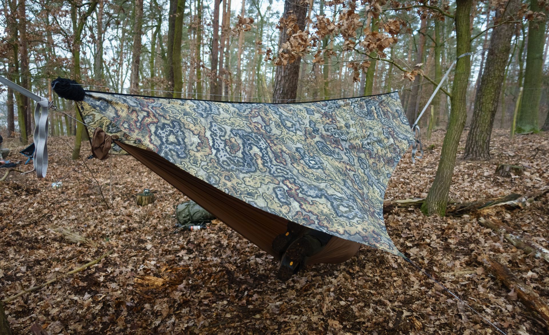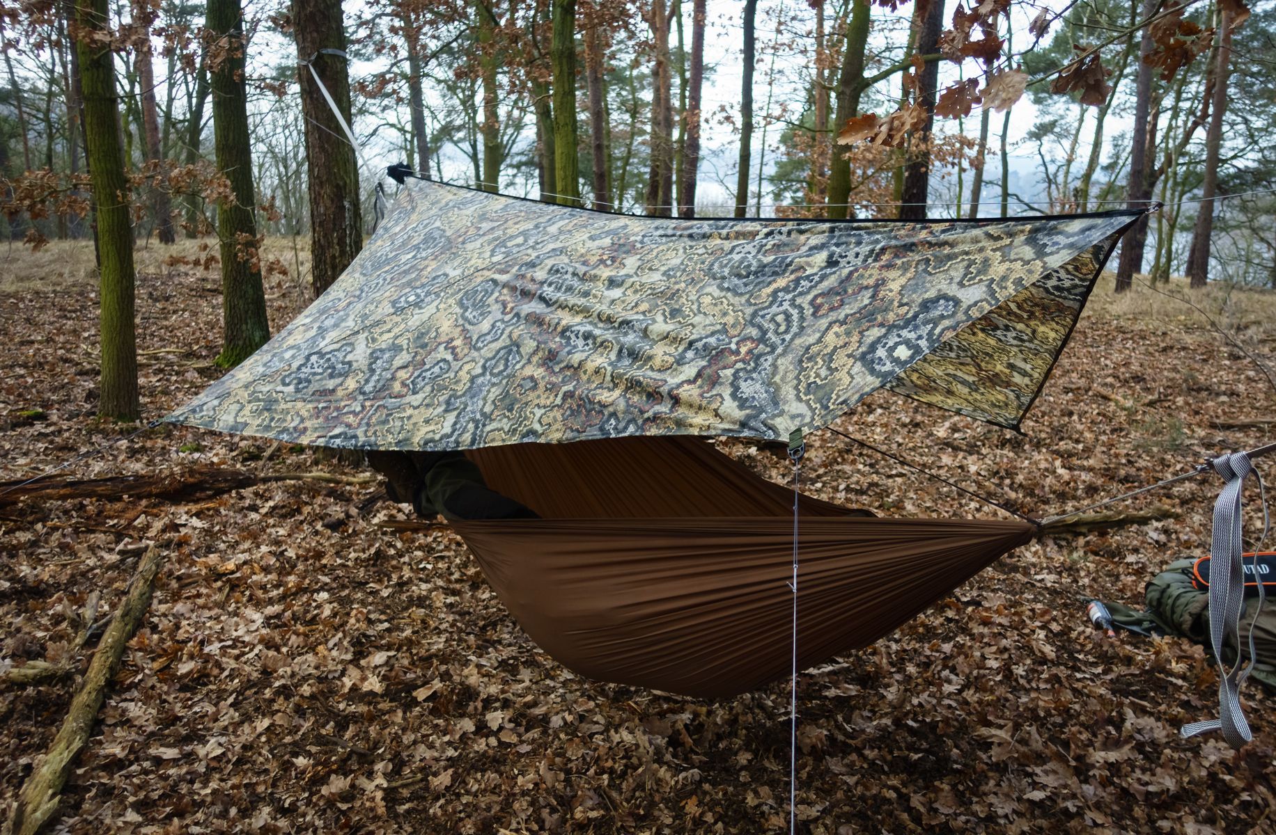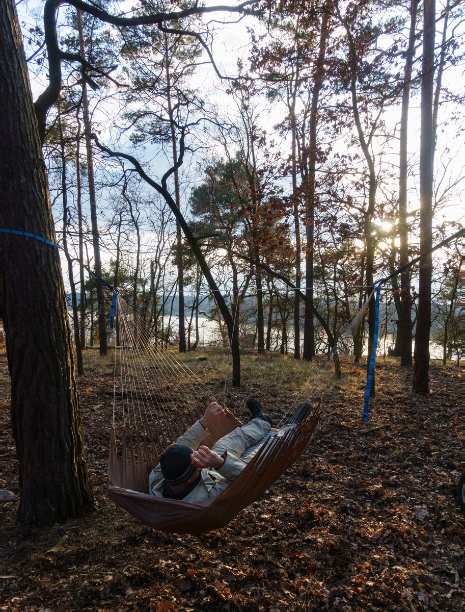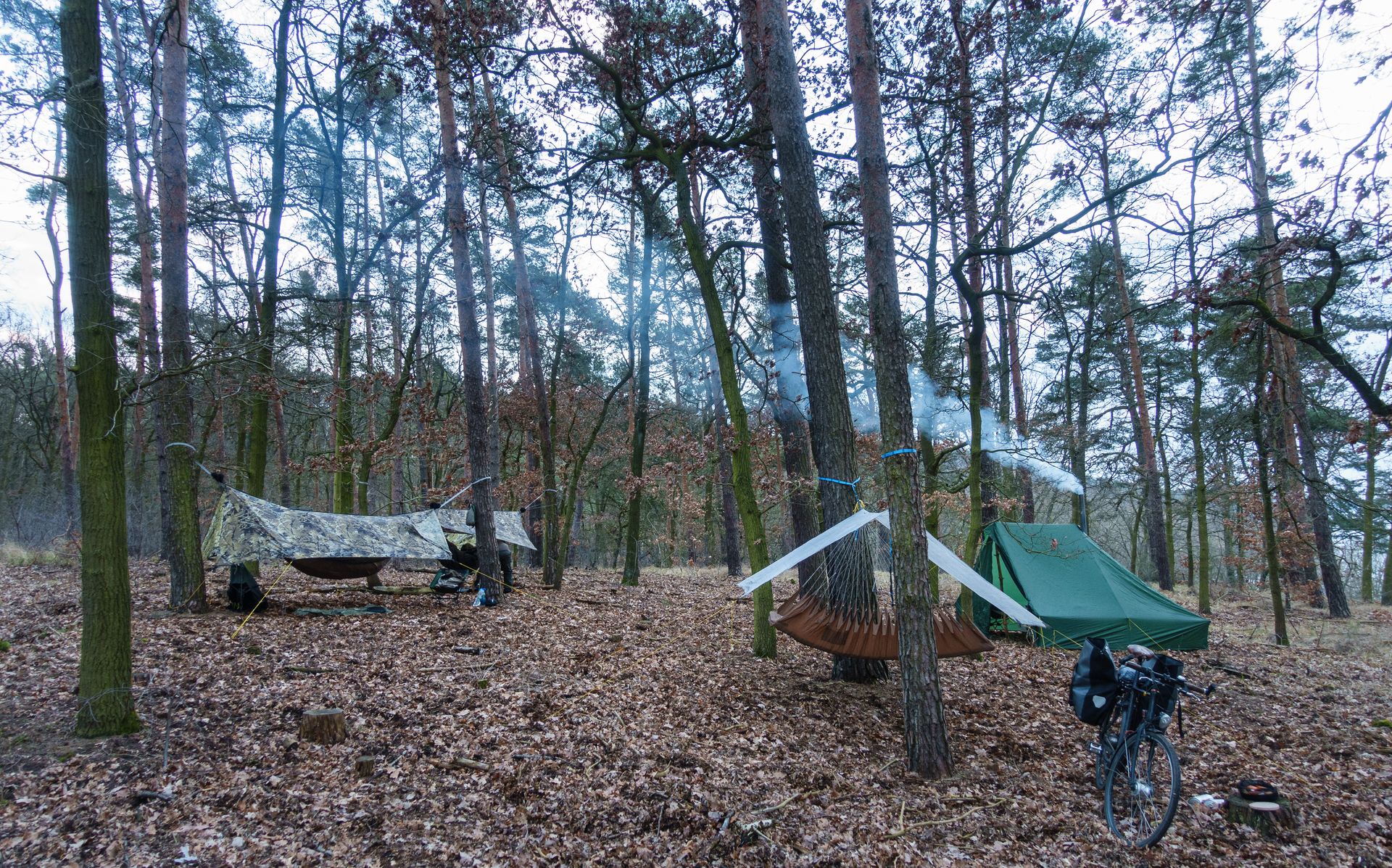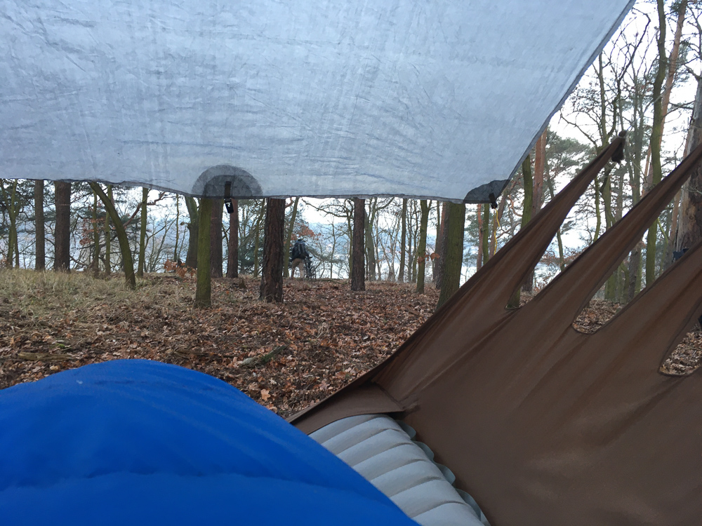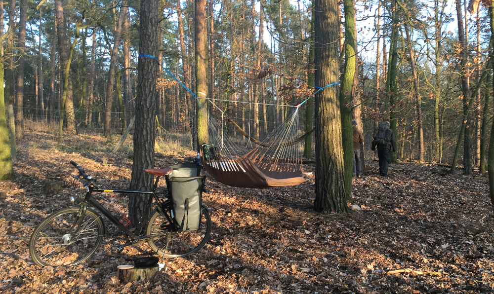 Ich nutzte die selben beiden Bäume wie immer. Moch und Furbrain inspizierten den (sehr trockenen) Baumbestand jedoch erst ausgiebig, bevor sie ihre Matten aufhängten.