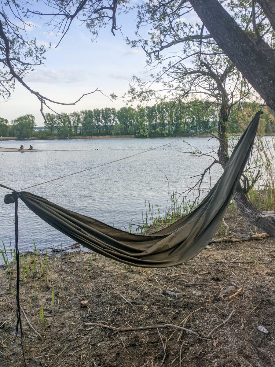 • Habe den WBW heute erstmals schön hinbekommen und aktuell ist sie ja noch über 370cm lang. Werde morgen damit los, das Tarp mitnehmen und mal die Firstschnur kürzer einstellen und schauen ob das mehr Komfort bringt und ich es noch komfortabel aufhängen kann. Unter das Tarp sollte es ja besser passen, da der Abstand von Ende zu Ende in der Horizontalen sich ja durch den steileren Hänge-winkel verringert.