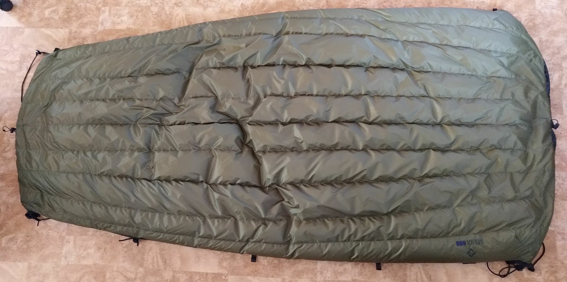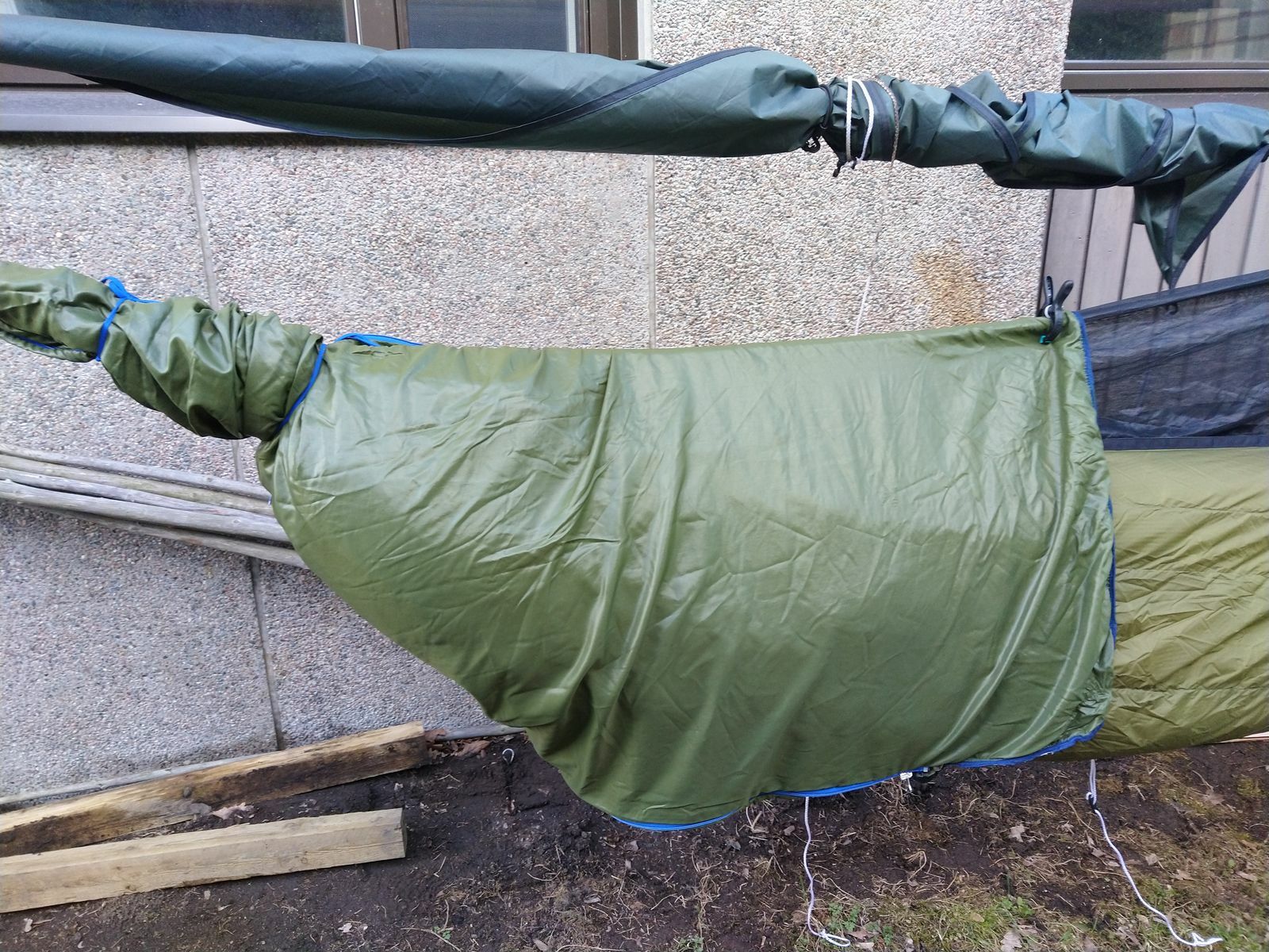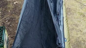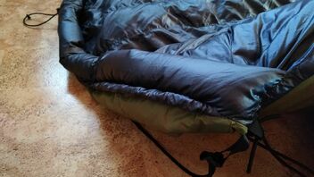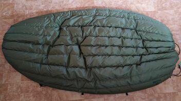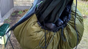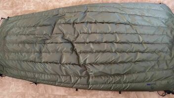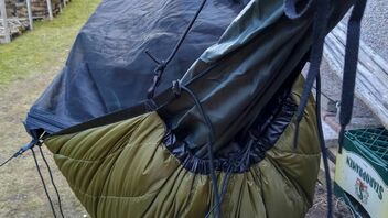 Zum zusätzlichen Windschutz am Fussende dann die Quick-and-dirty-0€-DIY "Viertel-Socke", aus dem Aussenstoff eines alten Deckenschlafsackes, die ändert am Komfort bzw. Abspannung nichts - Windrichtung natürlich vom Fussende her: