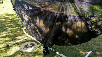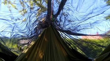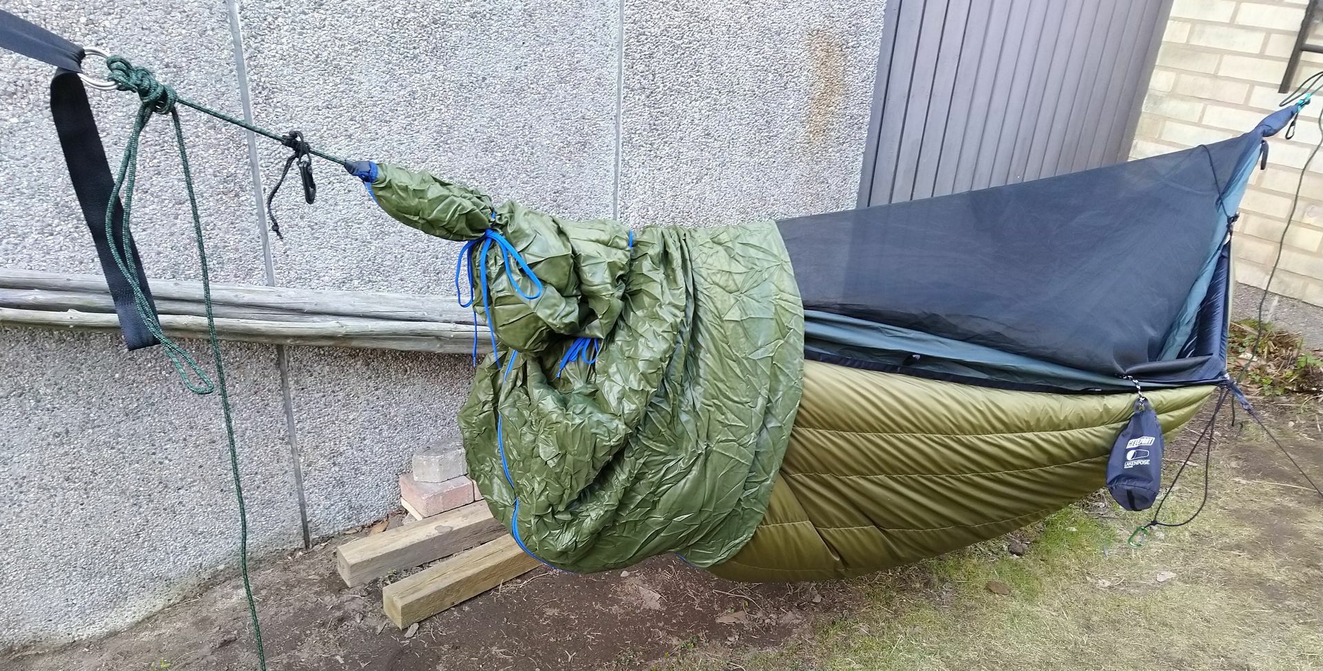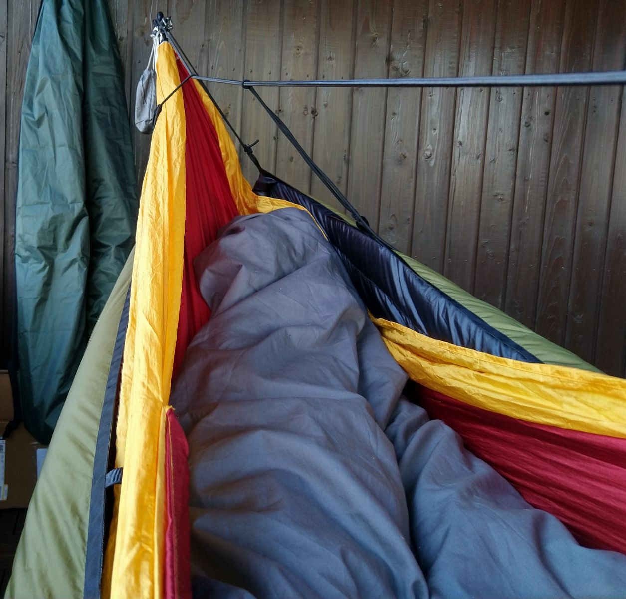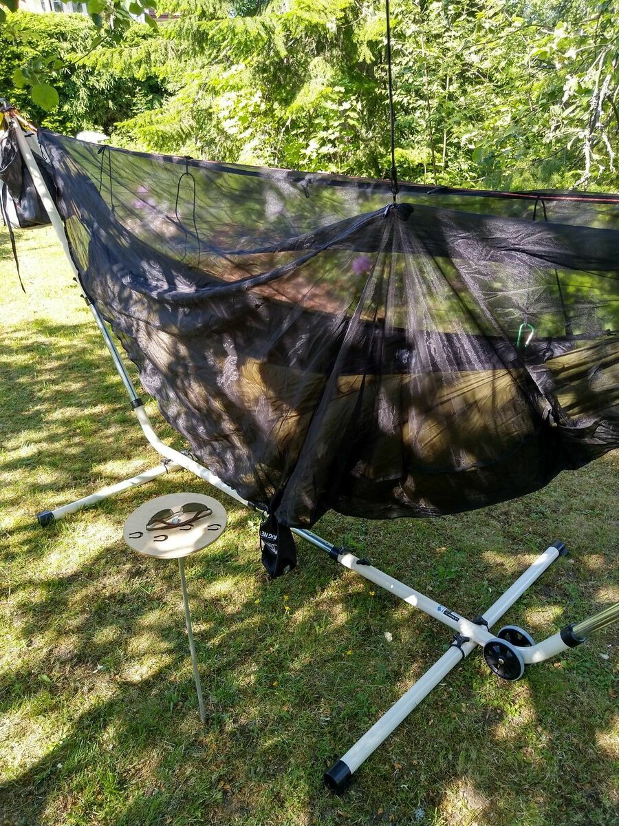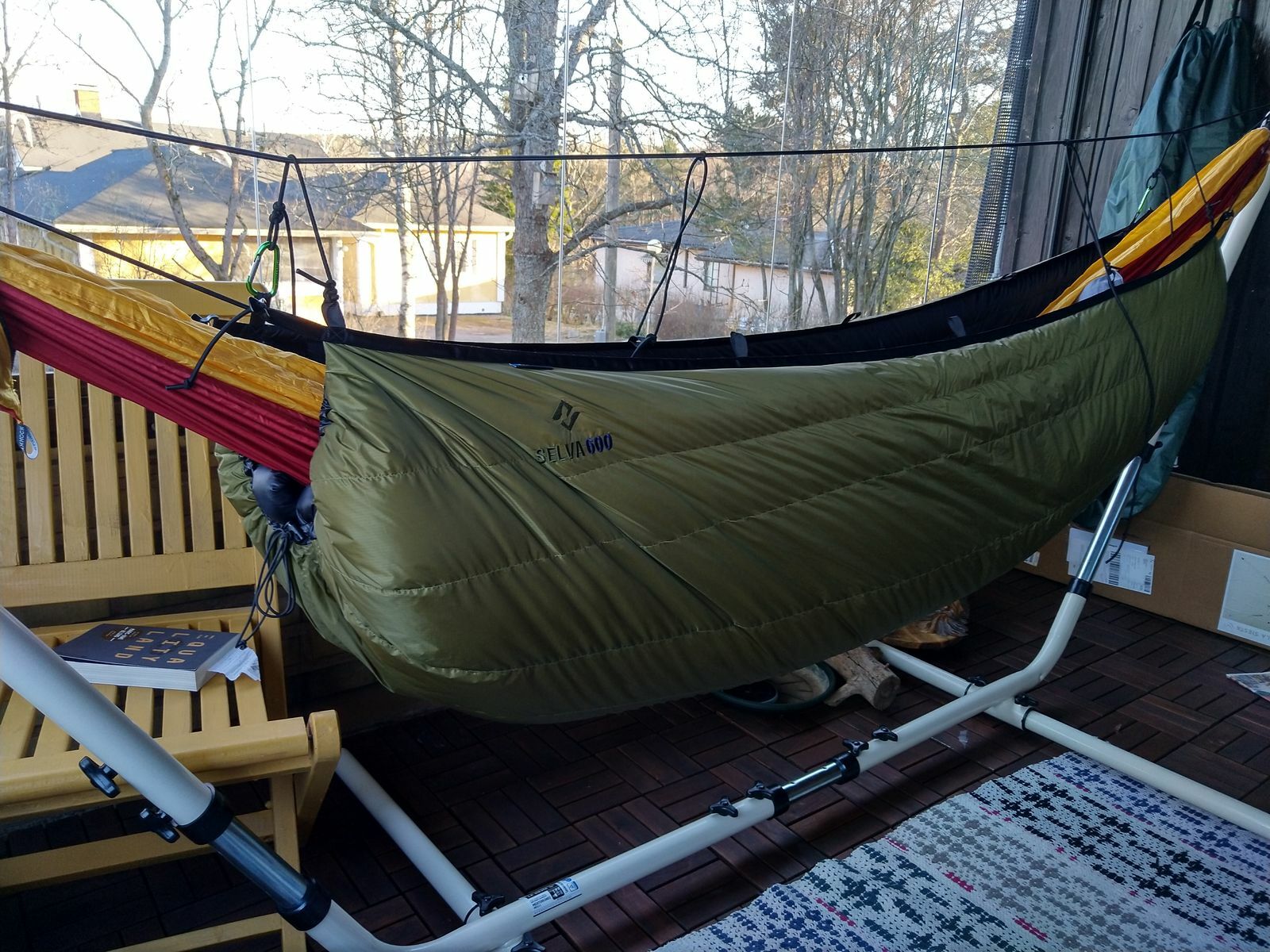 Da sie weder seitliche Befestigungslaschen, noch Ridgeline, geschweige denn Moskitonetz hat, habe ich sie bis jetzt nicht wirklich als "Unterwegsmatte" ernst genommen. Da sie aber etwas länger ist als meine beiden anderen, und ich inzwischen auch ein Gestell besitze - also auf der Glasterasse aufhängen kann - dann auch dieser Test.