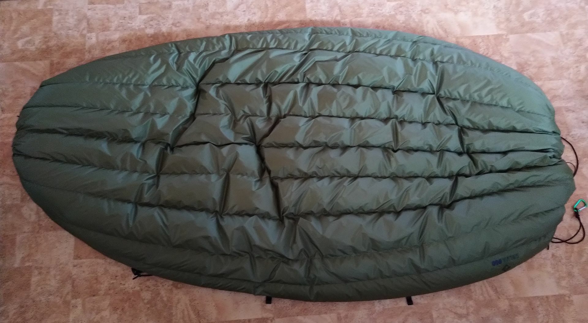 Als zusätzliche Sicherheit gegen Verrutschen in der Nacht benutze ich nun noch am diagonalen Fussende und Schulterende angebrachte, einseitige Gummikordeln (befestigt an den Schlaufen des UQs bei 3/4), auch hier mehr Länge gegeben als bisher, damit nichts einengt aber Zugspannung zunimmt sobald der UQ sich verschieben würde. Diese klinke ich mit Minikarabinern an der Ridgeline ein. (Siehe Bilder nachfolgend).