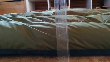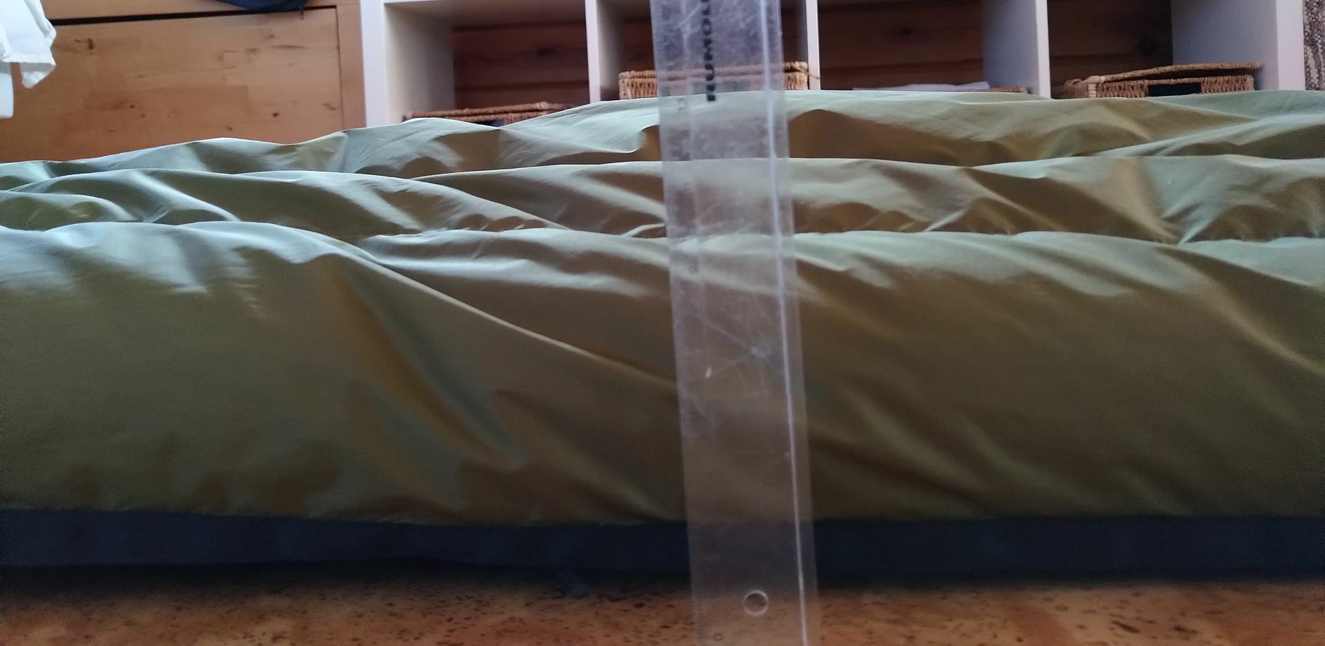 Aber wie man hoffentlich sieht: Sowohl Füsse als auch Schulter und Kopf passen trotz asymmetrischer Liegeposition locker in den "grünen Bereich". Was mit so einer kurzen HM halt geht. Der UQ hängt natürlich nicht mit dem selben Asymmetriewinkel wie der Körper, aber definitiv ausreichend um an allen Körperteilen (von stark angewinkelten Knien vielleicht abgesehen) warm zu bleiben und ohne in irgendeiner Form unbequem zu werden.