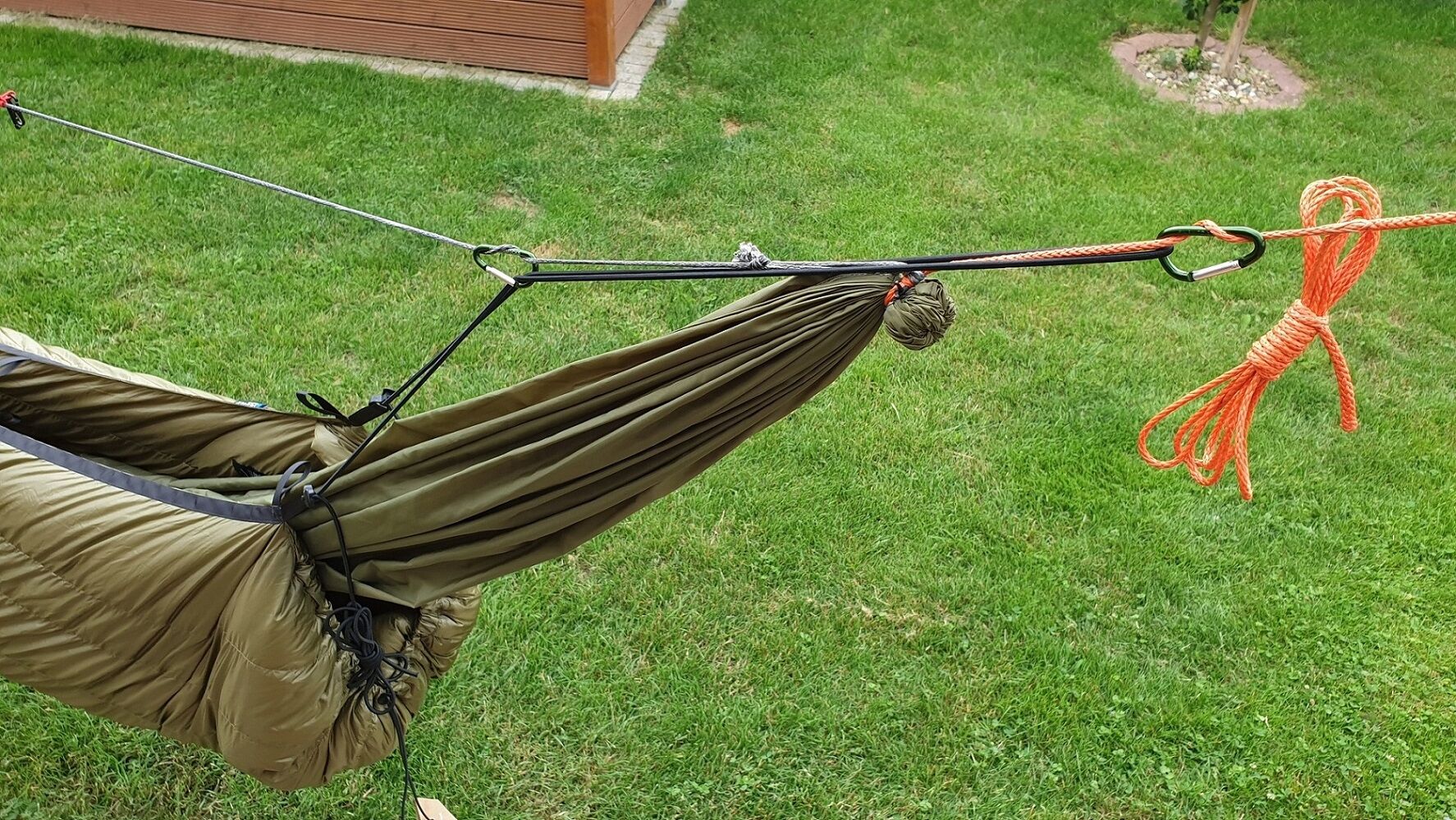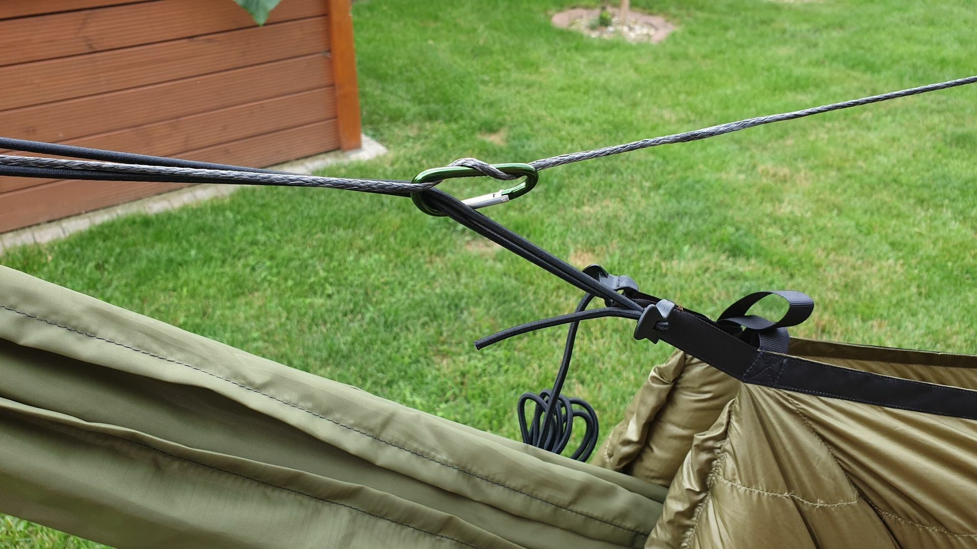 Einfach, dass keine Missverständnisse entstehen: Auch ich nutze Gummikordeln. Bei sehr langen Hängematten nutze ich aber eine Verlängerung aus einem nicht-elastischen Material, damit die Gummikordeln weder überstrapaziert, noch die Spannung des Unterquilts unnötig hoch wird. In der Regel setze ich die Verlängerung am Fussende an, da dann der Quilt für mich besser positioniert ist.