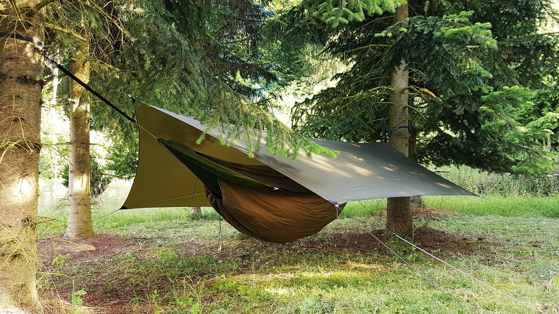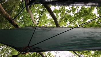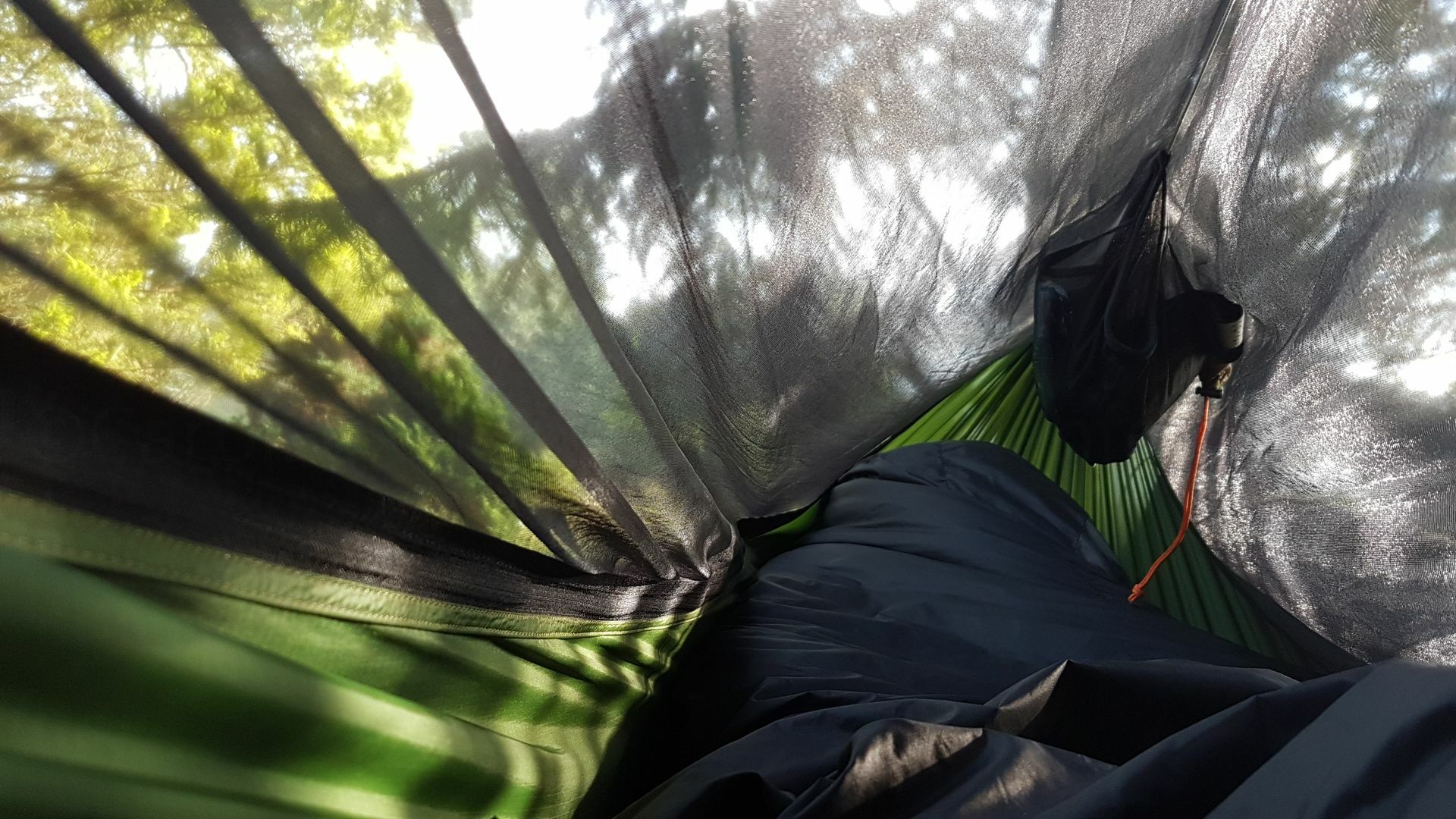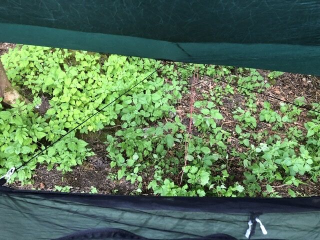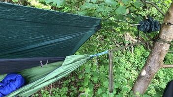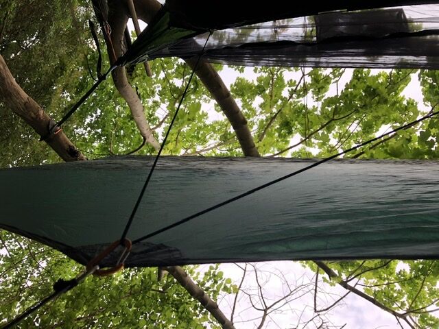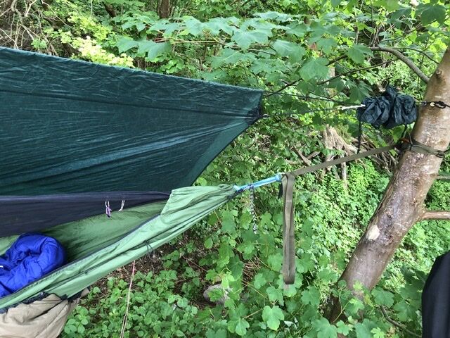 Das Underquilt scheint einfach zu breit für diese Hängematte zu sein. Wenn die Seiten des Underquilts an die Seitenabspannung der Matte stoßen ist unter der Matte noch ein Sack vom Underquilt der einfach nur rum schlabbert. Bei der Wärme grade kein Problem aber wenn es kälter wird wärmt das bestimmt nicht wirklich. Mit der Abspannung hab ich dann auch nicht weiter rum gespielt, da ist bestimmt noch Optimierungspotential. Insgesamt würde ich aber Sagen das es nicht das richtige Underquilt für diese Matte ist.