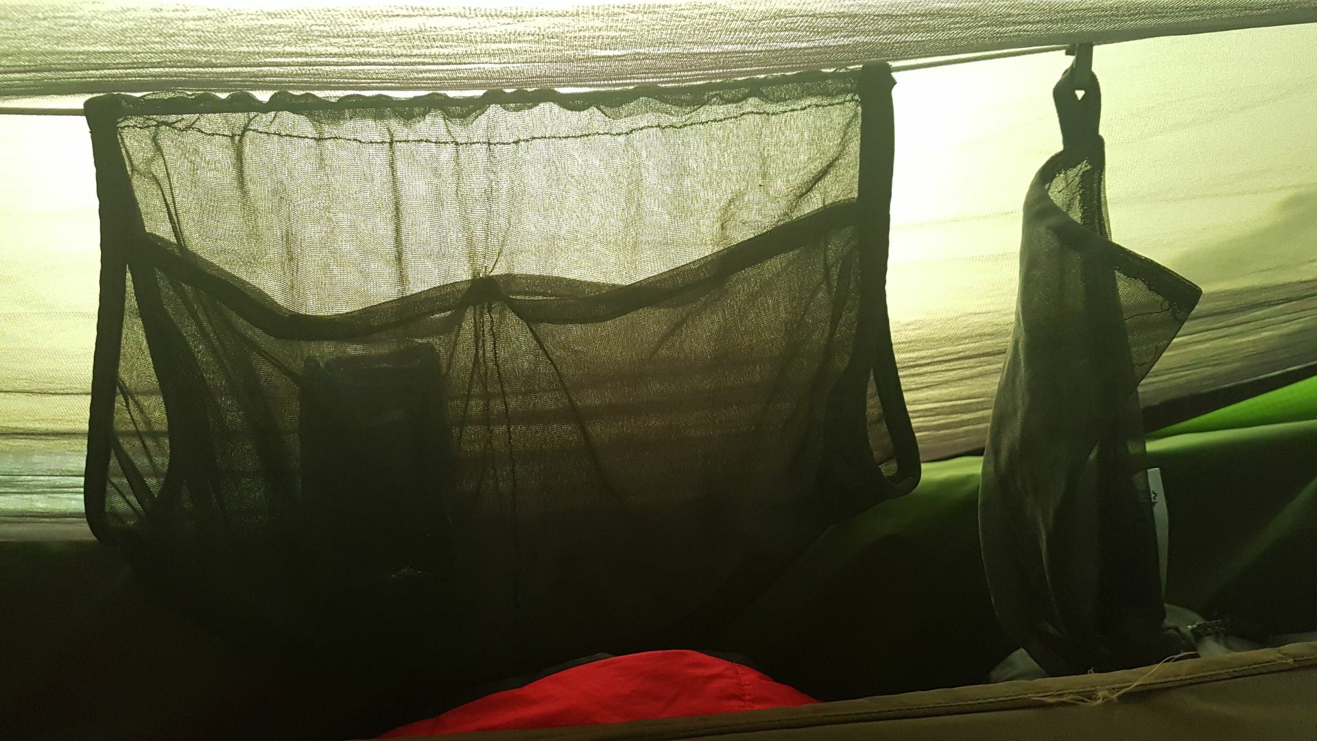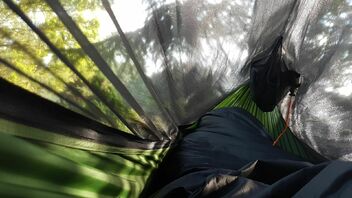 Ohne ihr meinen Eindruck zu schildern gab ich auch meine Frau gebeten die Hängematte zu testen und sie kam auf die gleichen Ergebnisse. Liegegefühl eigentlich recht angenehm aber das Fliegennetz ist nicht richtig gespannt und hängt ständig irgendwo im Weg. Der Raumeindruck in der Matte wirkt irgendwie beegend.