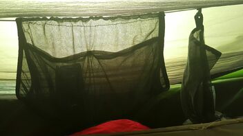 Auf den ersten Eindruck hat mir die Hängematte recht gut gefallen. Die Dehnung des Stoffes ist deutlich größer als bei meiner XLC ( 70d double layer ) aber ich habe das erst mal als recht angenehm empfunden. Es stellte sich aber recht schnell raus das ich irgendwie immer das Fliegennetz im Weg hatte. Erst war die Richline nicht gespannt da die Matte deutlich straffer aufgehangen werden musste als ich erwartet habe, dann wurden die Seiten der Matte durch die Seitenabspannung nicht wirklich aufgespannt. Evtl. wäre es besser geworden wenn ich die Seitenabspannung waagerecht zur Seite geführt, anstatt schräg nach unten, geführt hätte. Aber so war immer irgendwo loser Stoff der genervt hat.