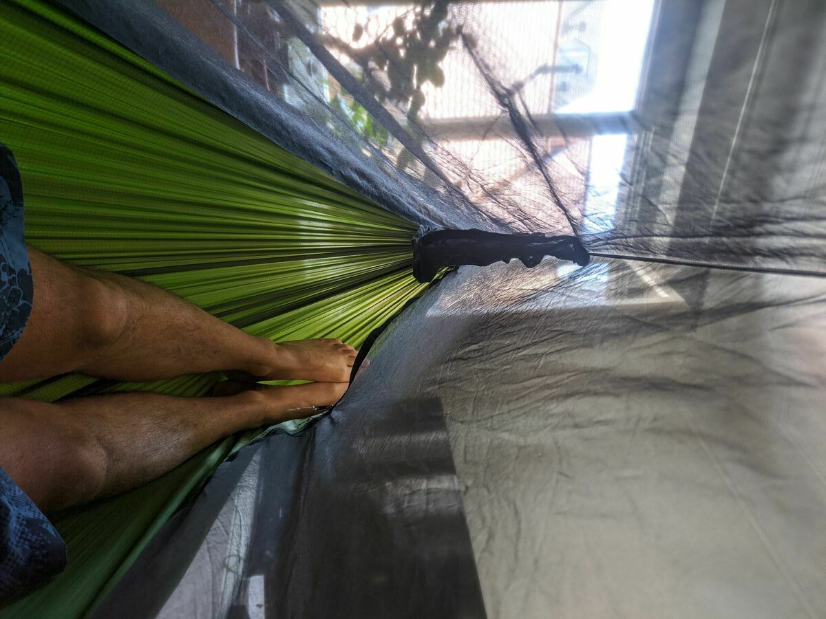 Erste Auffälligkeit: Die Hängematten Rigdeline ist niedriger als z.B. bei meinen HH oder meiner SLD Trail Lair. Ist beim sitzen leicht irritierend. Dann habe ich bei nicht benutzen der Seitenabspannschnüre das Moskitonetz leicht im Gesicht .