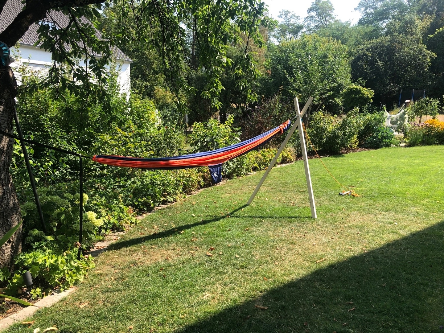 Auf die eine Seite kommt dann die Hängematte, auf der anderen Seite spann ich das ganze dann mit einem etwas kräftigeren Hering ab... Meistens durchtrenn ich beim Einschlagen des Herings das Kabel vom Rasenmähroboter, aber ich bin so recht flexibel, was die Ausrichtung der Hängematte angeht...