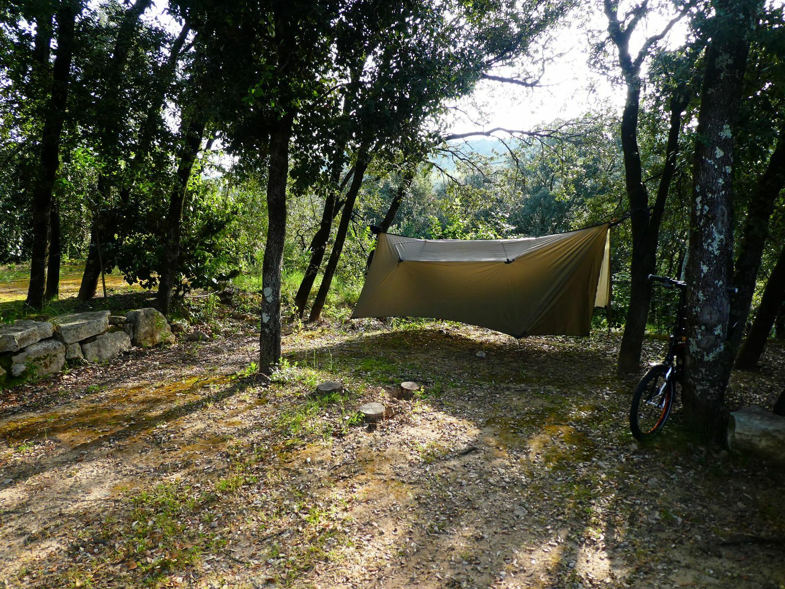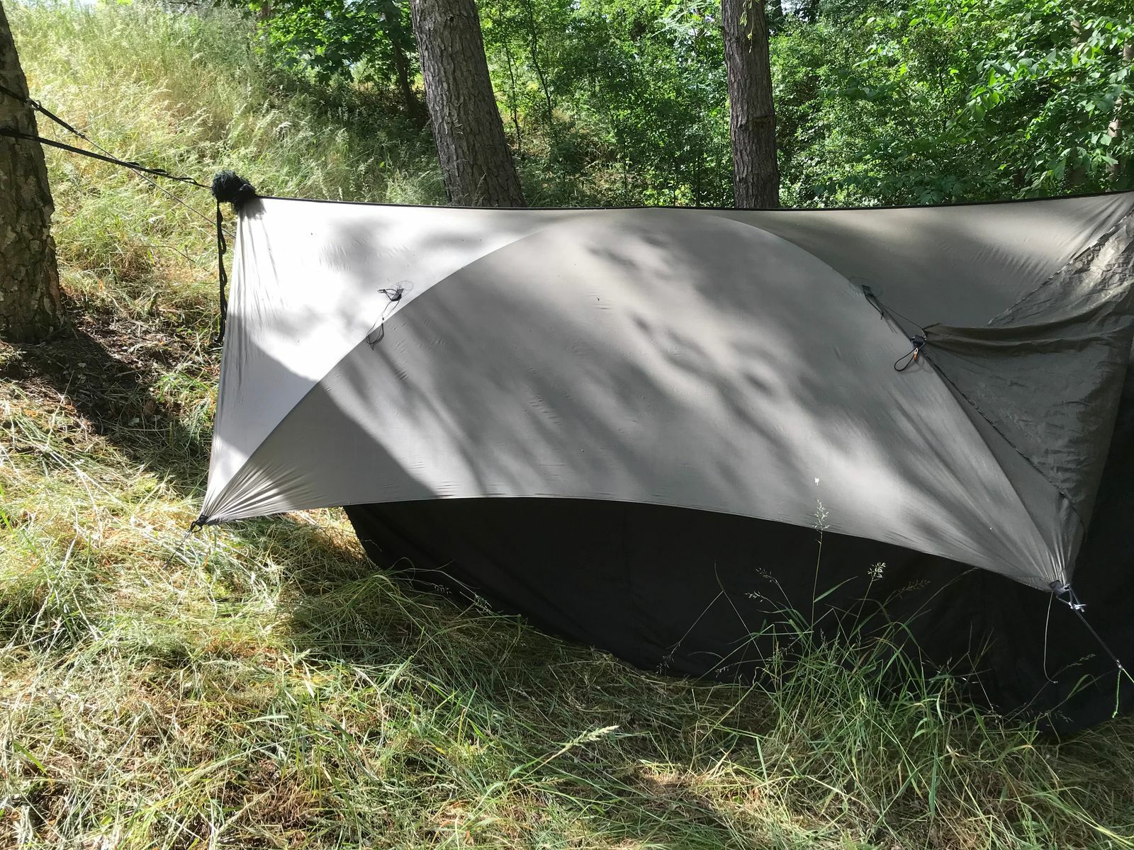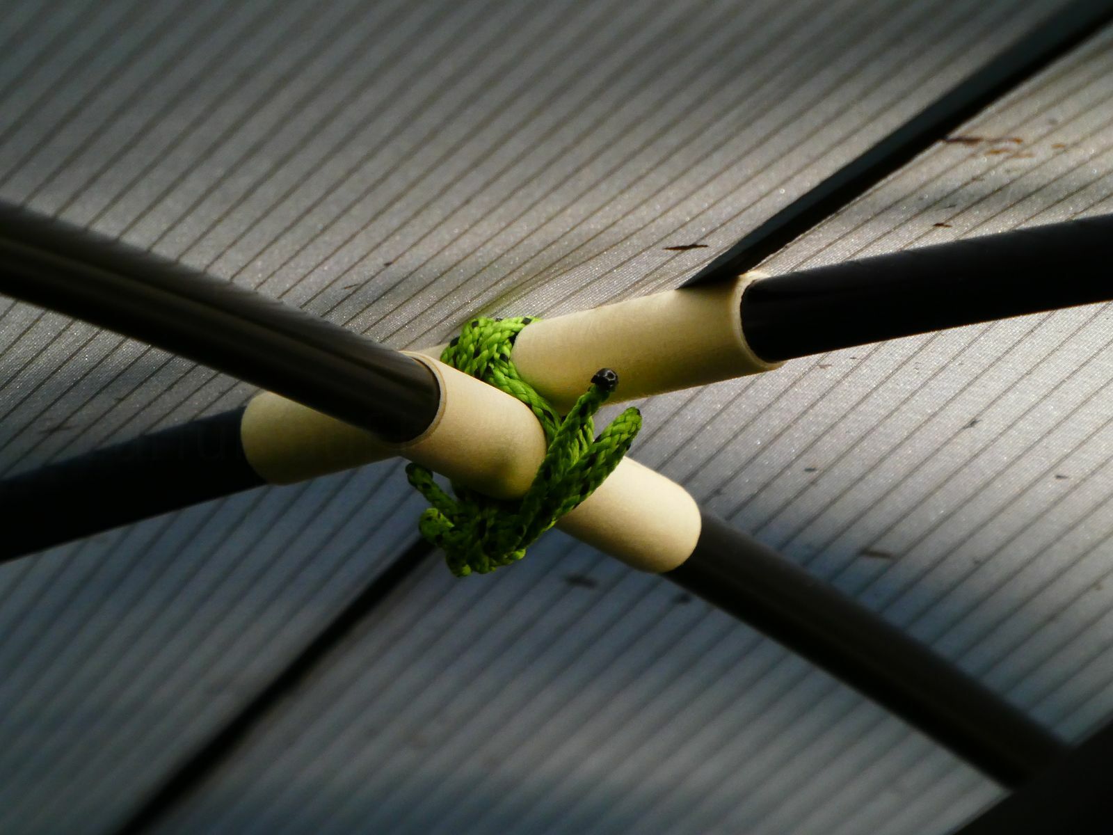 Die beiden Stangen verrutschen an dem Kreuzungspunkt in der Mitte allerdings stark, wenn man sie nicht gut miteinander verbindet: aber: nur verbinden reicht nicht. Deshalb habe ich beide Stangen rechts und links von der Mitte umwickelt und sie dann miteinander verbunden. So hält es super und die Stangen verschieben sich nicht mehr gegeneinander. Die ganze Konstruktion ist sehr stabil und bietet bestmöglichen Komfort unter dem Tarp mit optimaler Raumausnutzung.