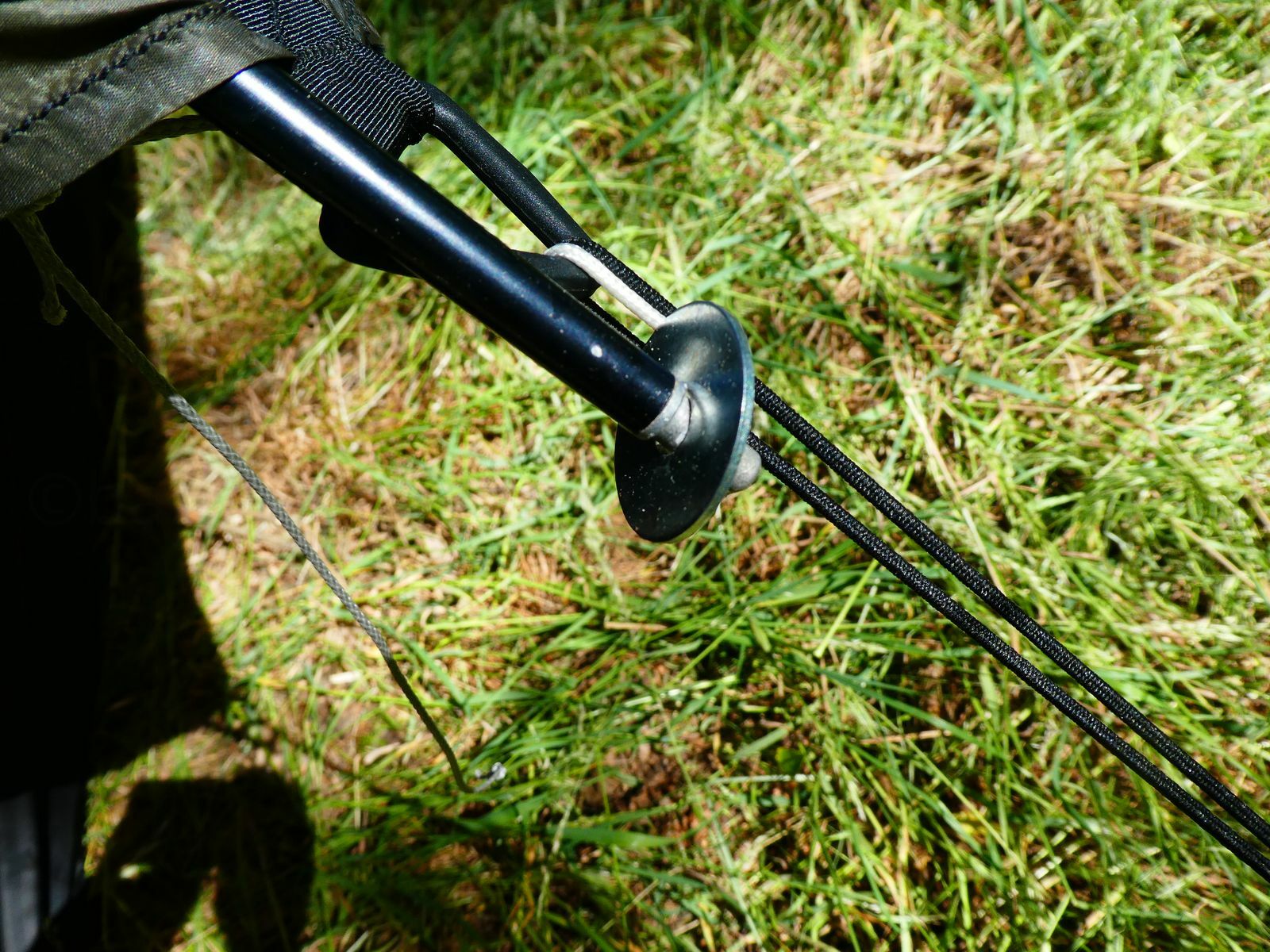 Bei den Alustangen handelt es sich um das Zeltgestäge meines uralten North Face VE 25 Zeltes: Alu T9 Stangen. Diese mußte ich am Tarp befestigen und habe das zur Probe erstmal ganz einfach gemacht: passende Unterlegscheiben angeknotet und die Stangenenden dort abgestützt. Da diese Lösung einfach und sehr praktisch ist habe ich es dabei belassen, obwohl man das sicher mit kleineren Scheiben oder sonstwie leichter hinkriegen würde.