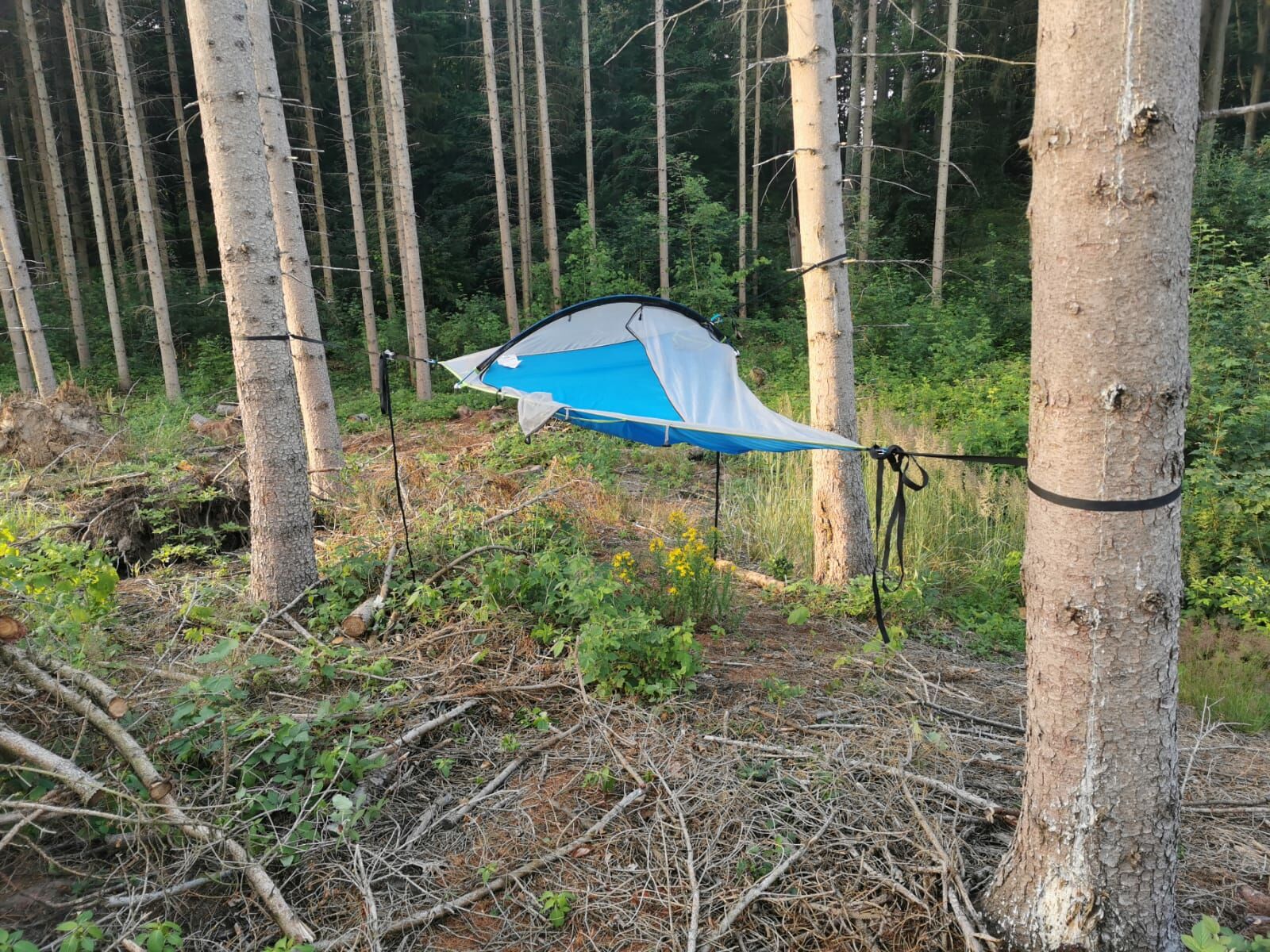 ich bin neu hier. Vielleicht kurz zu mir. 43 Jahre, sportlich, ehrgeizig, verrückt. Fahre bei MTB-Wettkämpfen mit (24 Stunden Rennen, CC etc.), radle am Tag schon mal 380km mit dem Trekkingrad und Gepäck und absolvierte auch viele Male den Stoneman Miriquidi an je einem Tag. Ich nenne mehrere Tentsile-Zelte mein Eigen, im entferntesten Sinne sind es ja auch Hängematten. Damit machte ich gute Erfahrungen, allerdings sucht man manchmal eine Weile, bis man drei Bäume gefunden hat, die etwa im gleichseitigen Dreieck zueinander stehen. Daher kommt bei meinen Reisen zur Ostsee aus dem Erzgebirge oft ein Gepäck von über 20kg zusammen. Letzte Woche radelte ich am ersten Tag 380km, am zweiten die restlichen 100 bis Stralsund. Ich übernachtete in meinem Tentsile Una. Mir ist klar, dass es eine Grauzone ist. Zelten im Wald ist verboten, biwakieren oder in der Hängematte aber erlaubt. Ich hinterlasse meinen Schlafplatz stets sauber und ohne Schäden. Mitunter ist es recht ruhig, manchmal schreckt aber auch ein Rehbock. Ist man das nicht gewohnt, kann das schnell gruselig sein. ![]()