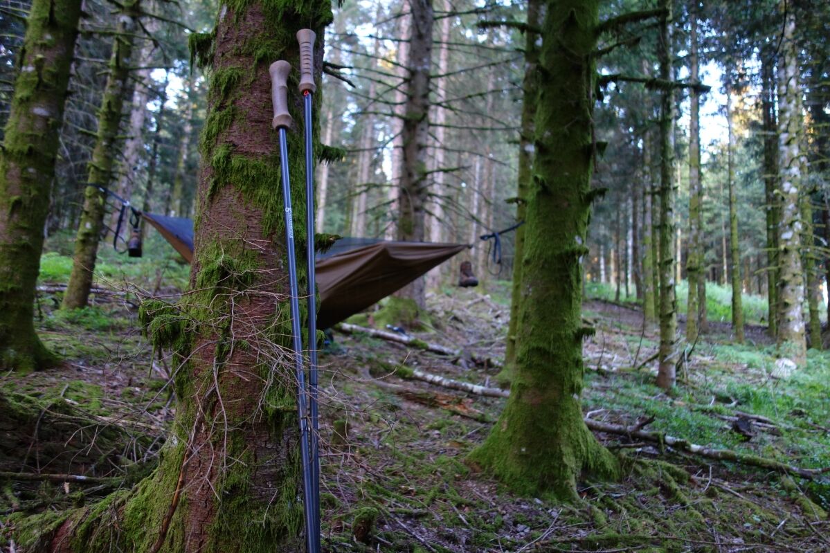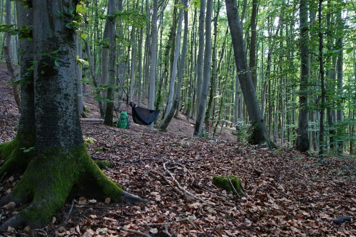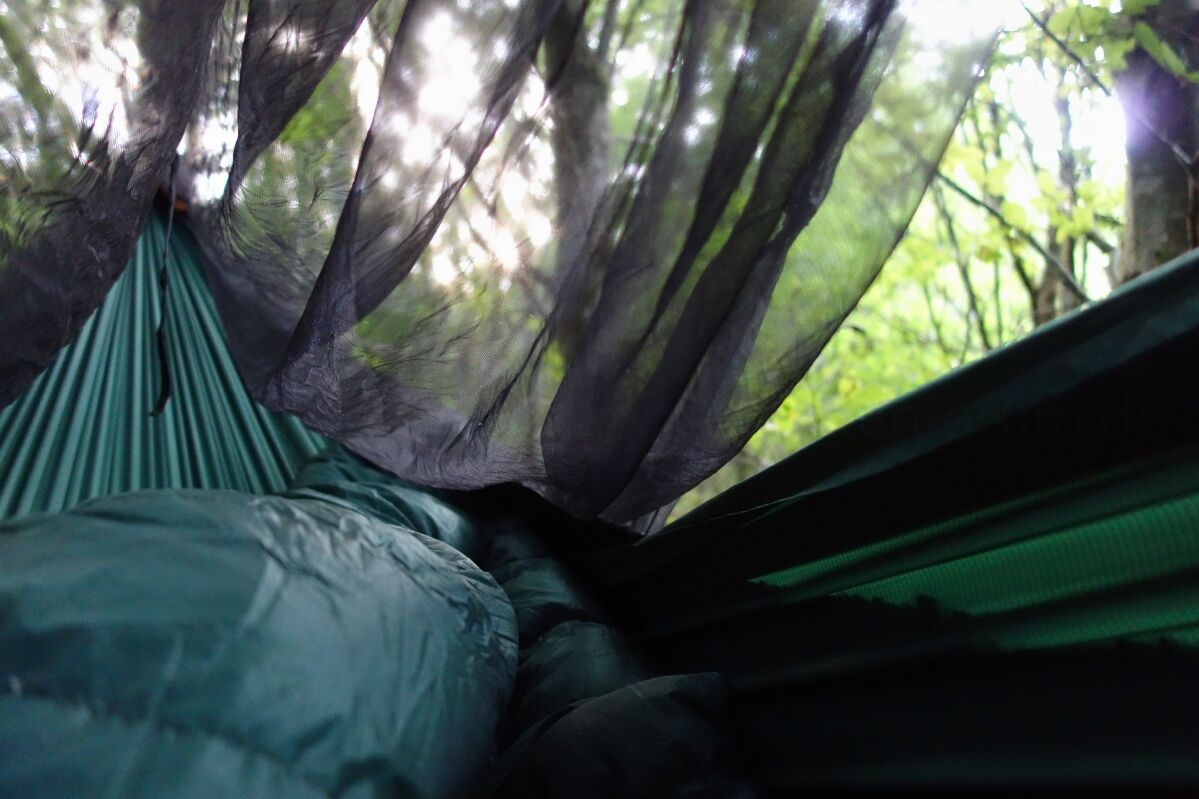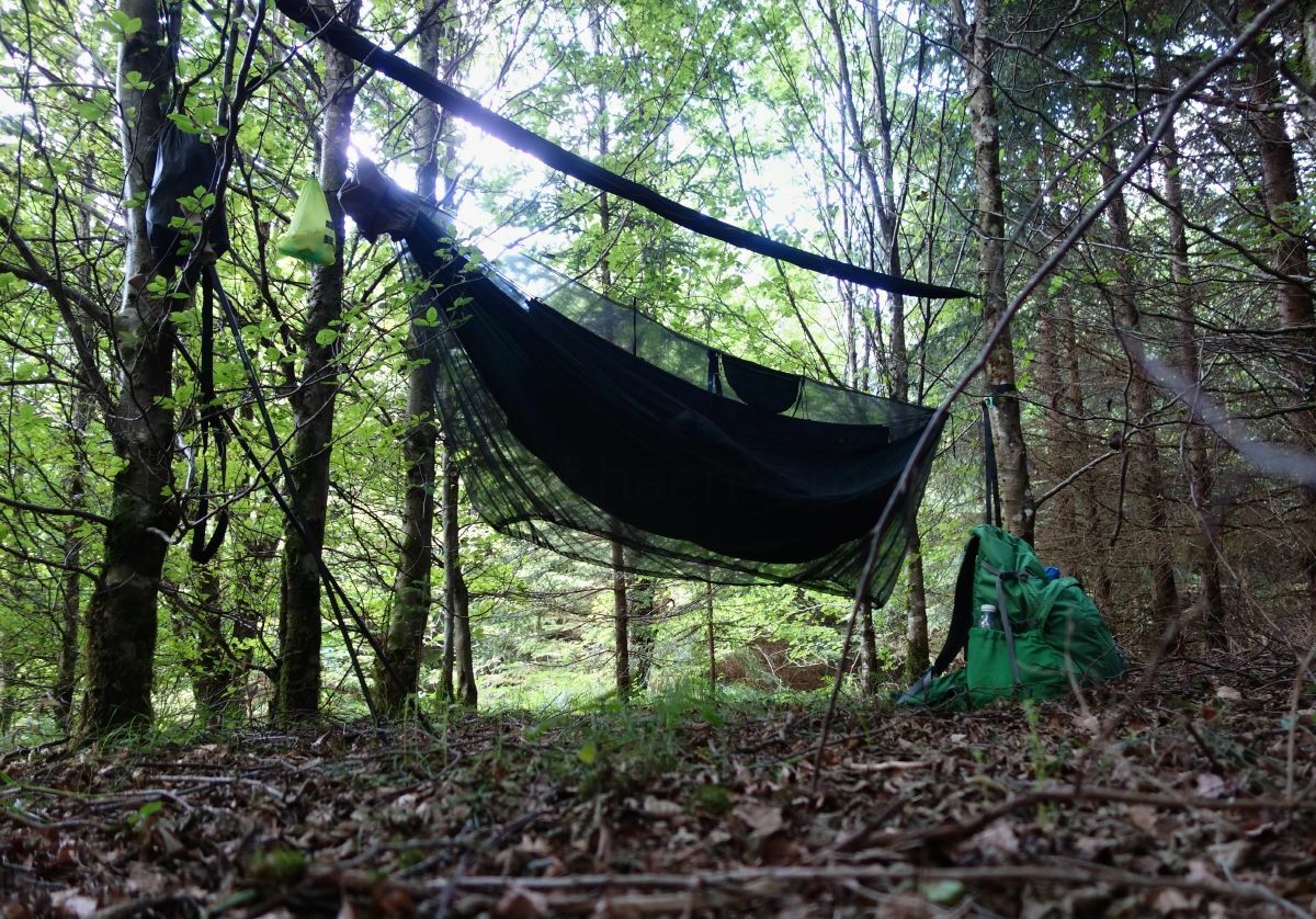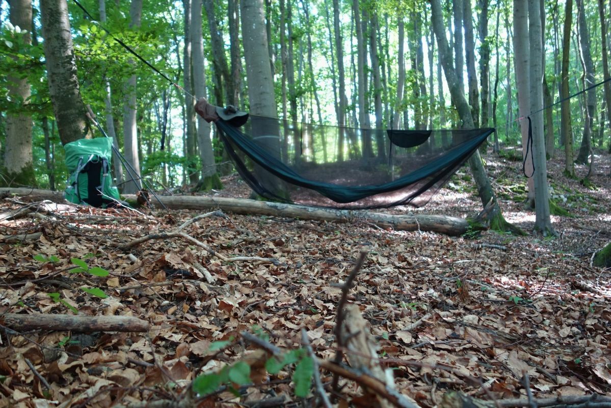 Wir hatten beide unsere Hängematten dabei: er seine Warbonnet Blackbird XLC und ich mein überarbeitetes Opus 2 aus dem Jahr 2016 (meine erste ganz ohne fremde Hilfe genähte Hängematte) mit dem ebenfalls überarbeiteten Moskitonetz im Fronkey-Style.