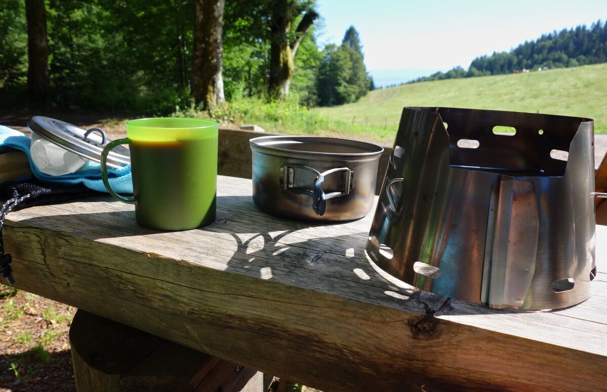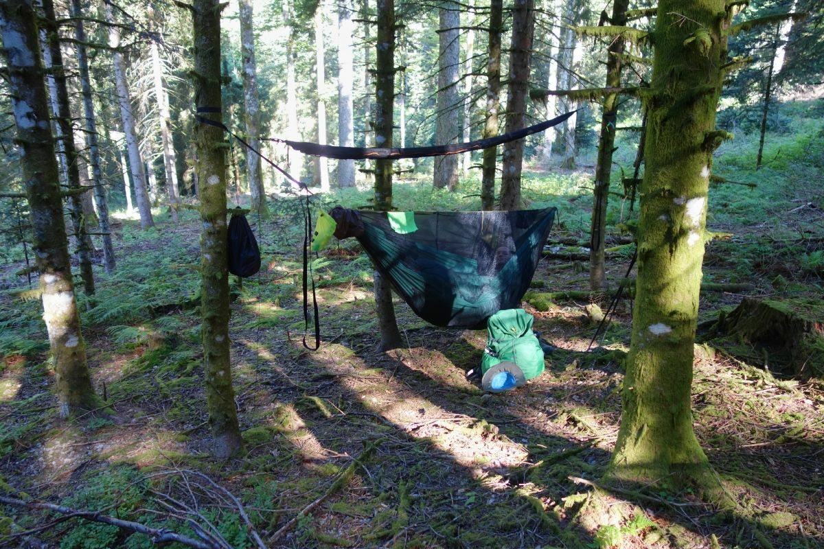 Die erste Übernachtung hatten wir bald nach Degerfelden an einem wenig spektakulären Ort, der aber seinen Zweck erfüllte. Am Morgen bauten wir unsere Hängematten bei leichtem Regen ab.