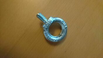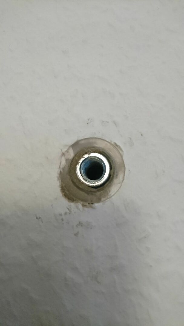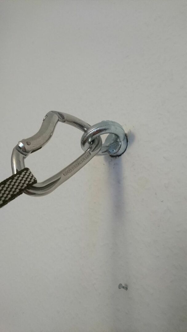 Darein wird eine M10er Ringöse eingeschraubt, die bei Nichtbenutzung wieder entfernt werden kann. Das Gewindeloch wird dann bis zur nächsten Nutzung hinter einem dekorativen Bild versteckt.