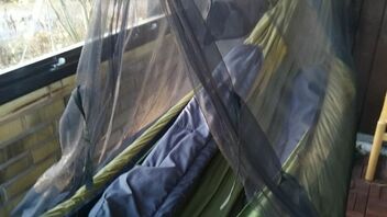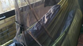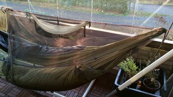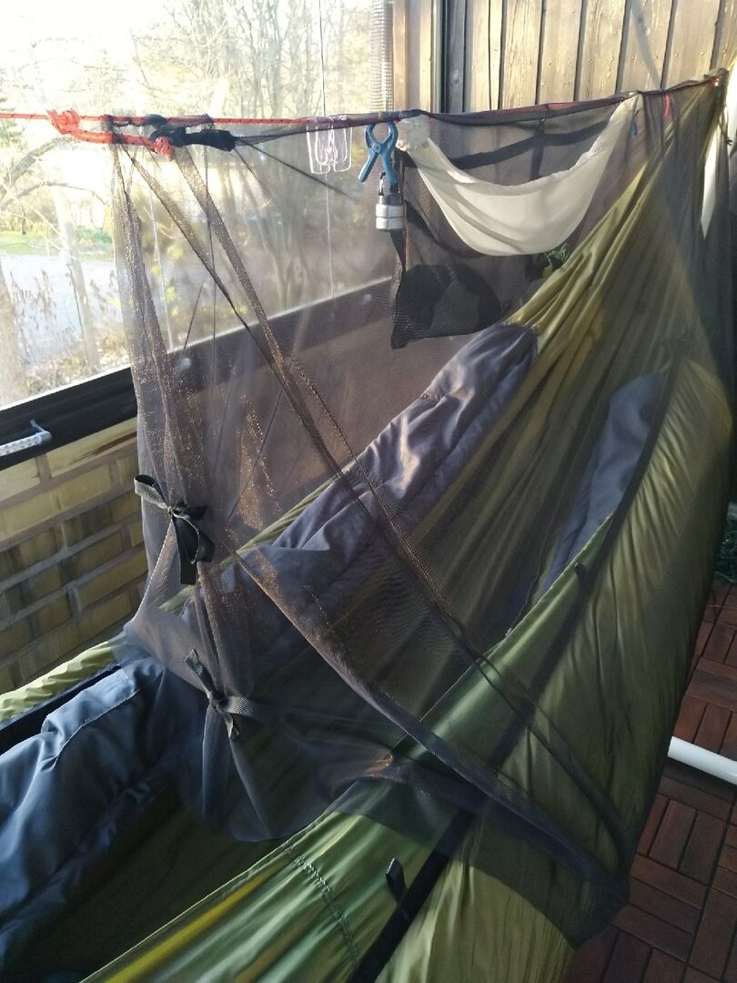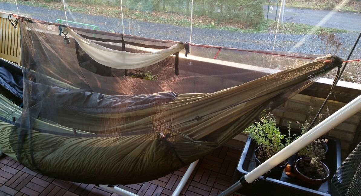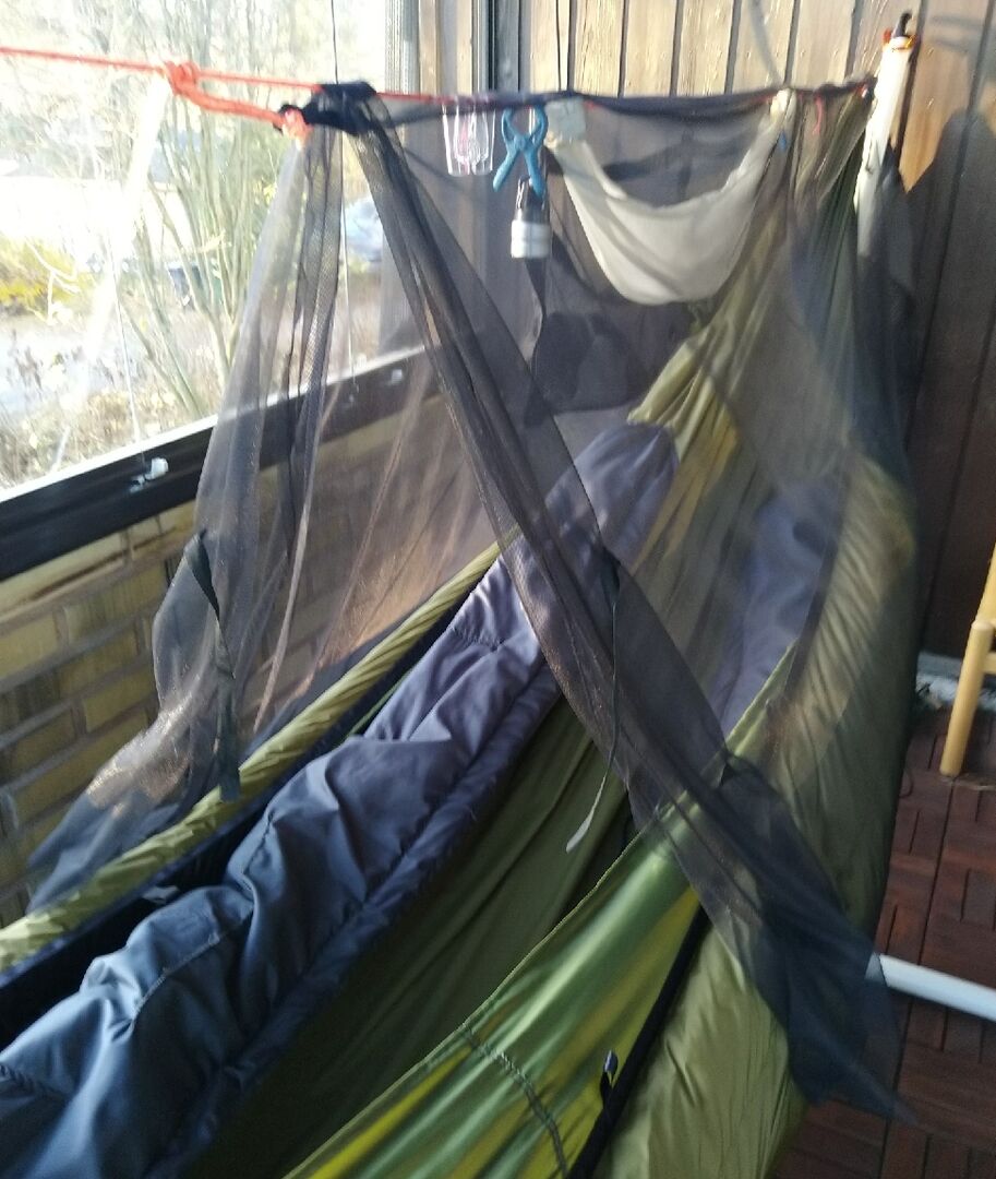 ...Habe auch gerade ein teilabdeckendes Moskitonetz genäht, das ich ausserhalb der Kernzeit (zur moralischen Beruhigung) oder aus Gewichts-/Komfortgründen anstatt meines vollen Bugnets zu nutzen gedenke.