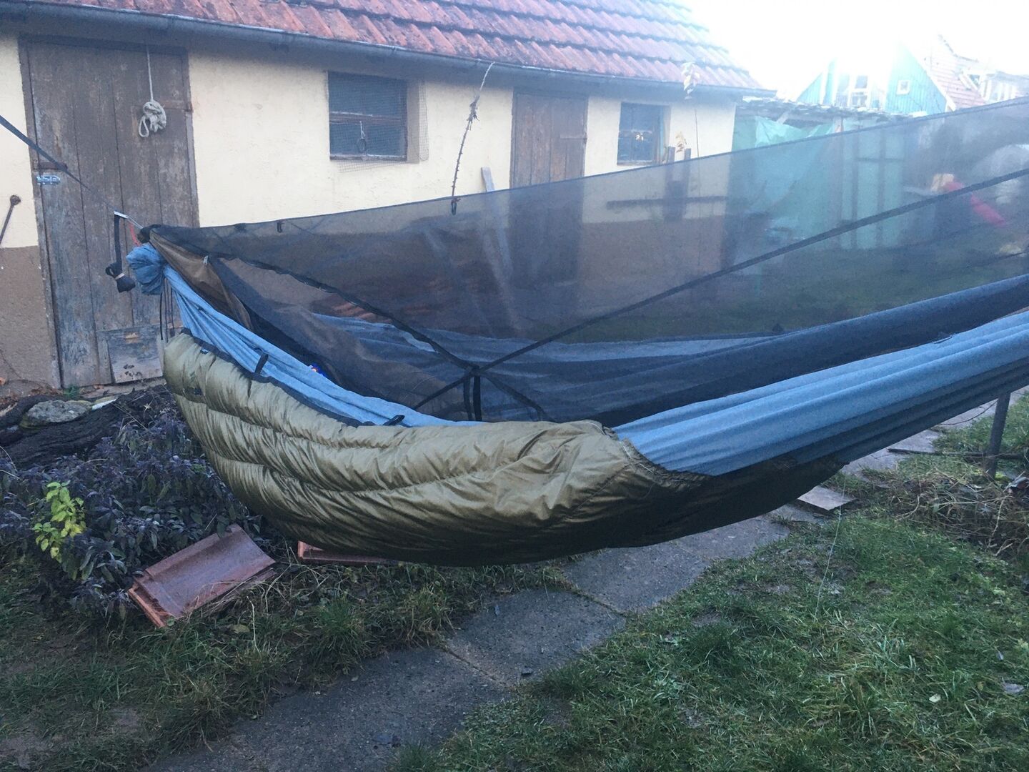 Eigentlich hatte ich vor, die Cocoon auch weiterhin solo als Gelegenheits-Thermohängematte zu verwenden, das traue ich mich aber glaube ich jetzt nicht mehr, da der Stoff durch die Nähte und die teilweise eingnähten Falten bestimmt belastet ist. Solo weiß ich auch nicht, ob die starke Stoffdehnung nicht doch den Cumulus mit dehnt, kommt mir riskant vor. Soll also als reiner Underquilt verwendet werden.