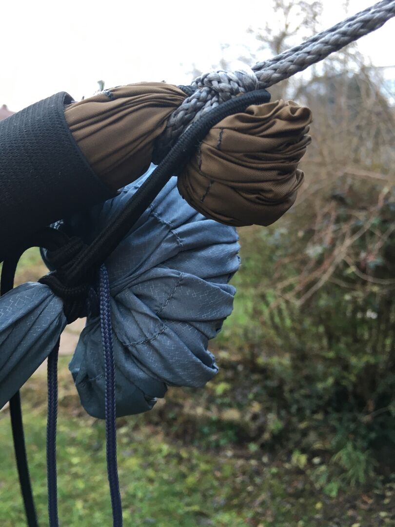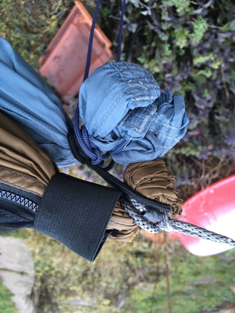 ähnlich, viel Gummikordel und 2 Karabiner ersetzt mit 220g Stoff... ist mit der aktuellen Aufhängung knapp 100g schwerer als davor, für deutlich mehr Komfort 🙂 Ich bin jetzt bei knapp 3,5 kg insgesamt für Hängematte, Underquilt, Topquilt, Tarp, Rucksack und das Ganze versorgt mich noch gut um die 5 Grad...(genauerer Temperaturtest steht noch aus). Bin zufrieden 😀