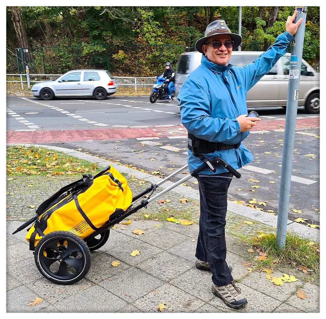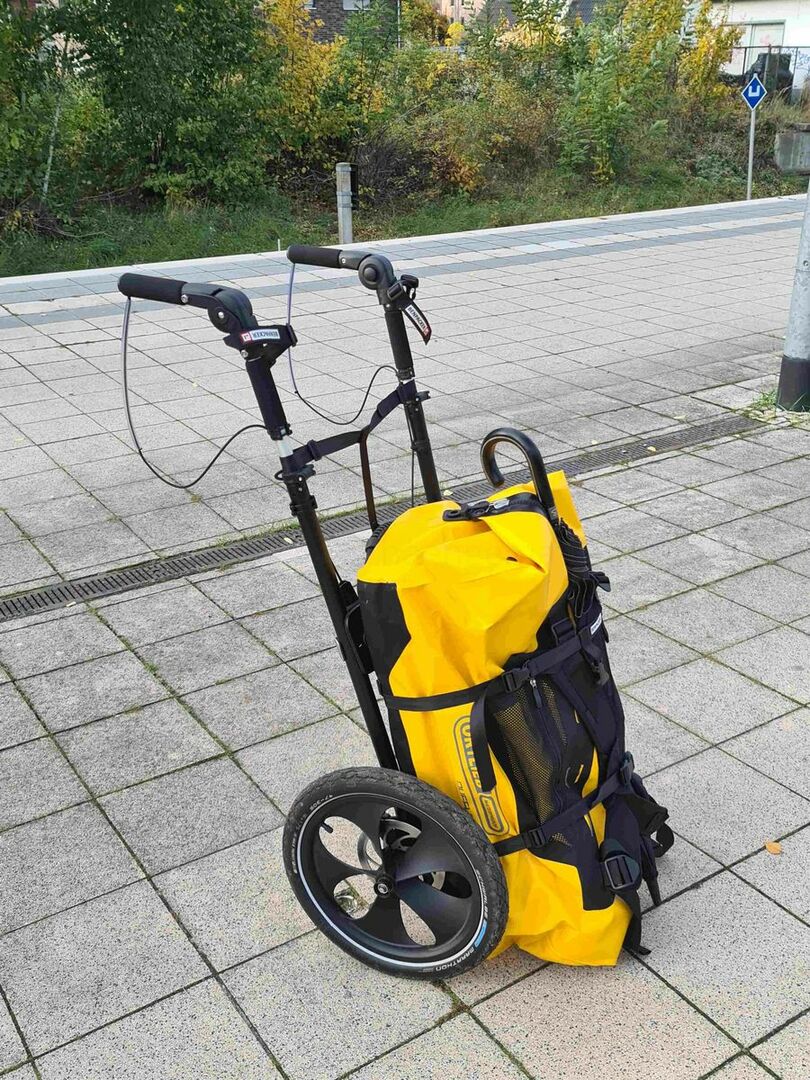 Was absolut unschlagbar an dem Wanderwagen ist, ist seine absolute Geländetauglich- und Vielseitigkeit. Er geht mühelos sogar Treppen und unwegsames Gelände mit hoch, ist sogar mit Scheibenbremsen versehen und wenn ich meinen Rucksack auf ihn geschnallt habe, kann ich ihn sogar in absolut unwegsamen Gelände das Gefährt samt Rucksack auf dem Rücken tragen. Praktisch bei längeren Treppen oder engen Steigungen im gebirgigen / felsigem Gelände.