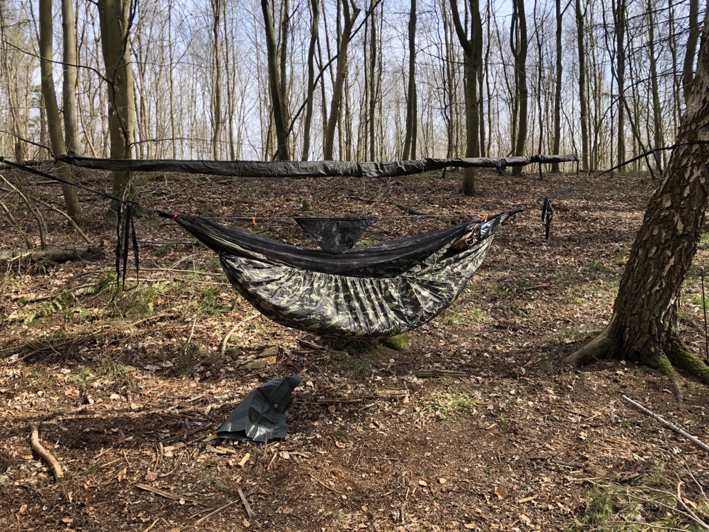 - dann entweder erst Hängematte oder erst Tarp in die Webschlaufengurten einhängen