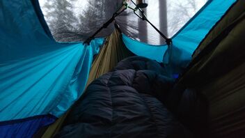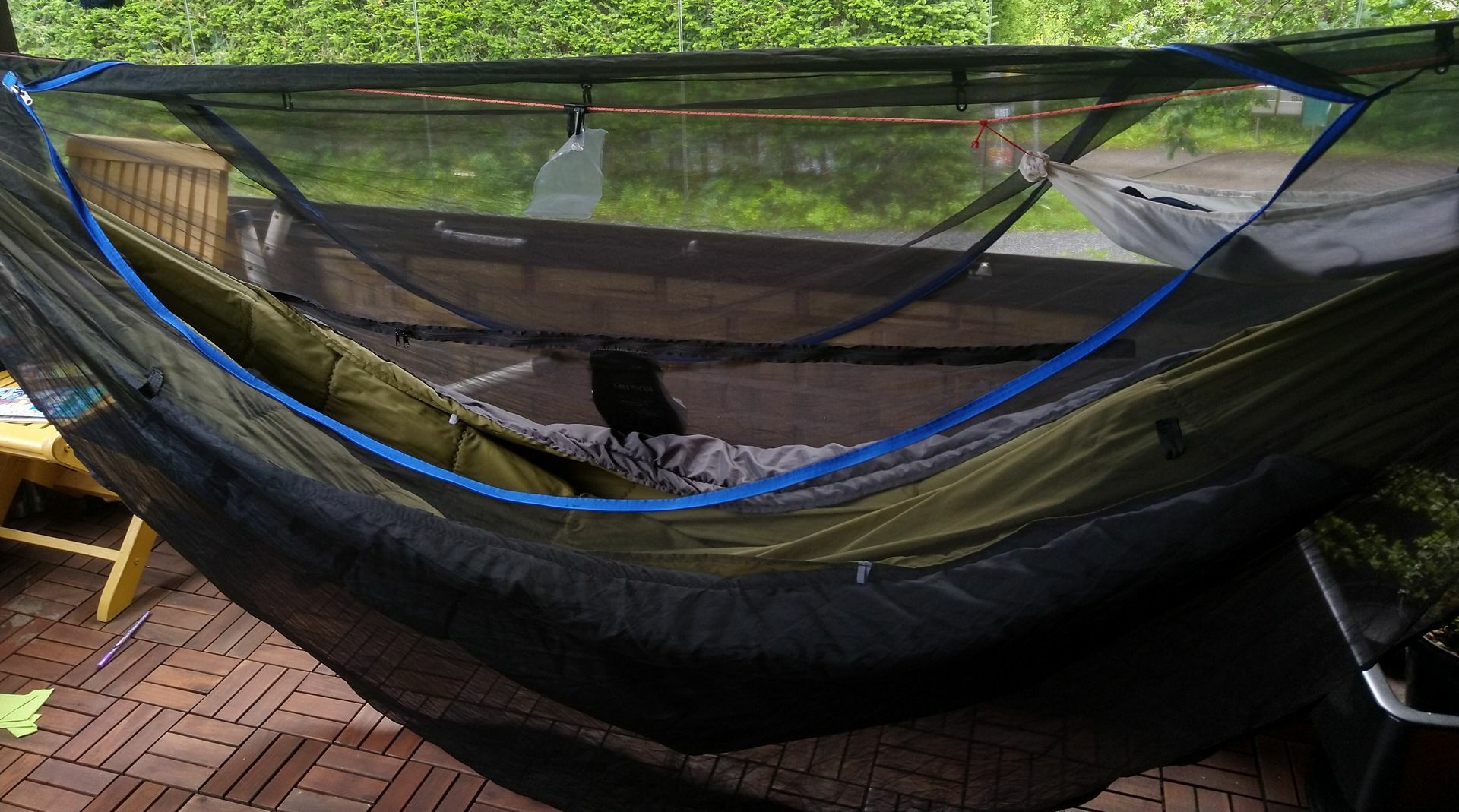 Da das Bugnet momentan recht locker unter dem Underquilt hängt, könnte man hier gut windschützendes, leichtes Rippstopp-Nylon einbringen, ohne dass wie oft bei einem UQ-Protektor der Stoff eng am UQ anliegt. (Wind wird zwar gelegentlichen Kontakt herstellen aber was solls...)