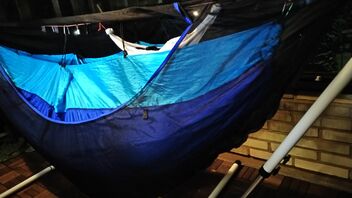 Des weiteren möchte ich, dass der UQ weitesgehend seitlich von windabweisendem Stoff abgedeckt ist, der Stoff aber nicht unbedingt unten komplett verbunden ist (dann Moskitonetz dort, wie momentan).