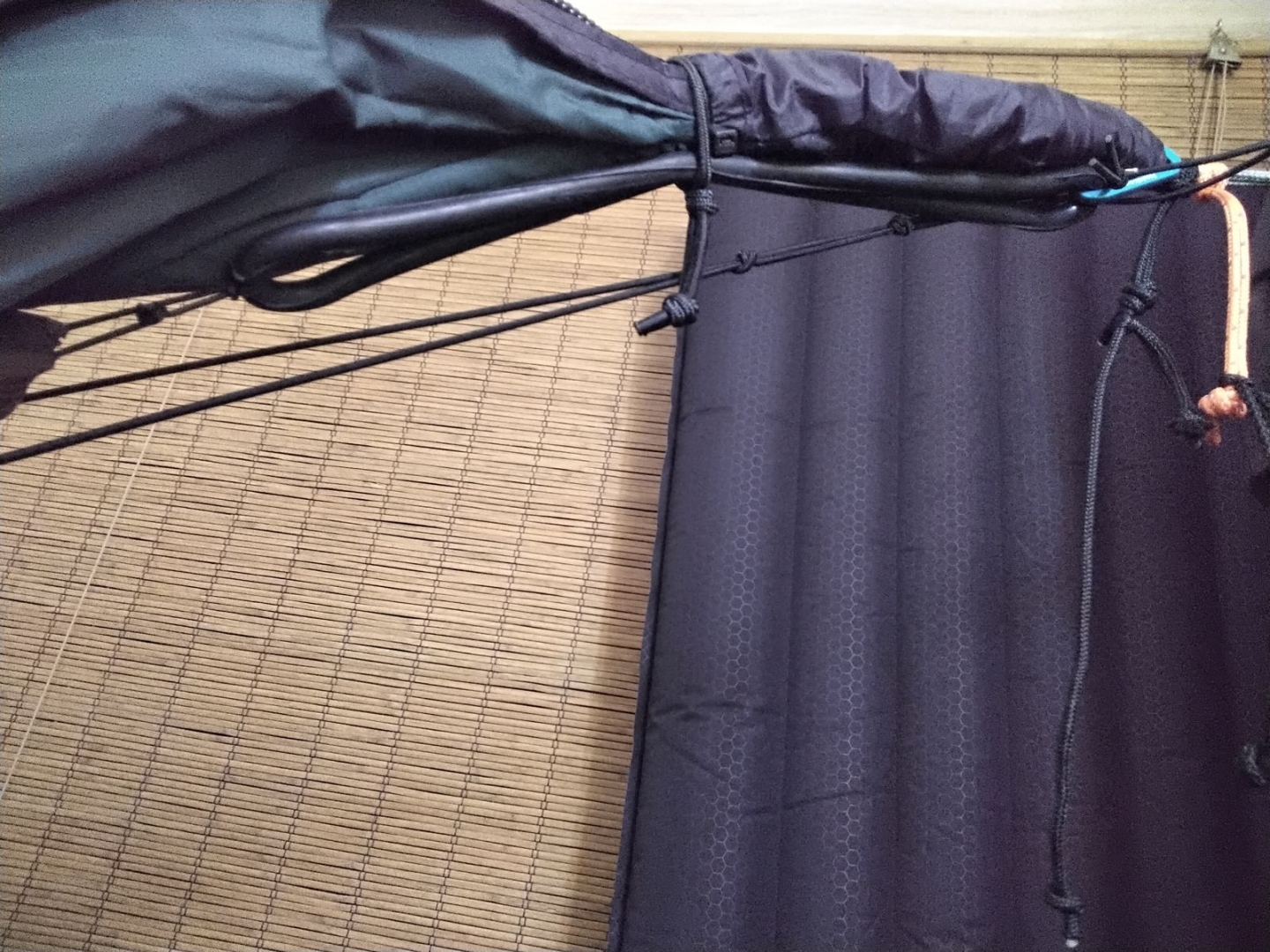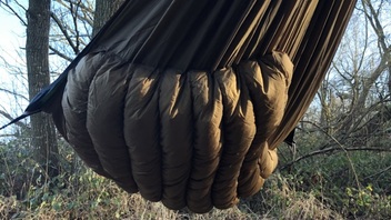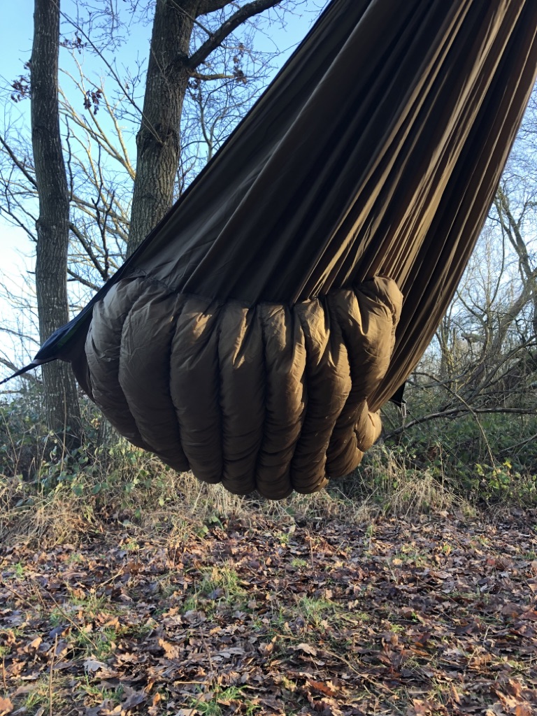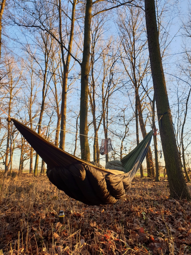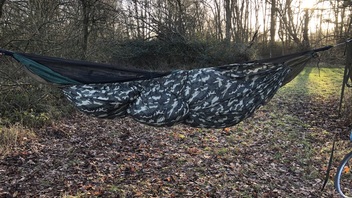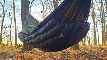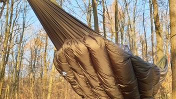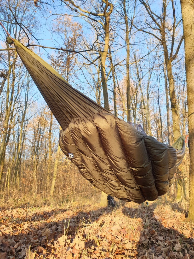 Wie schon mal erwähnt, habe ich mir einen 12ft Wooki (12ft Trägerstoff, Isolation ist gleich) als Linkslieger schneidern lassen. Temperaturbereich 10°F, Farbe nennt sich dark foliage und ist ein 15D Ripstop Nylon.