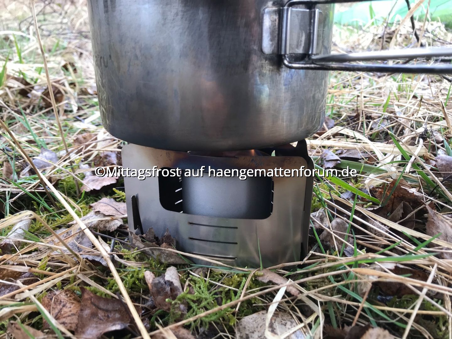 Zwar nicht in Titan, sondern Edelstahl, aber trotzdem sehr leicht: die Bushbox UL. Hier im Foto mit dem Lixada-Toaks-Siphon-Klon.