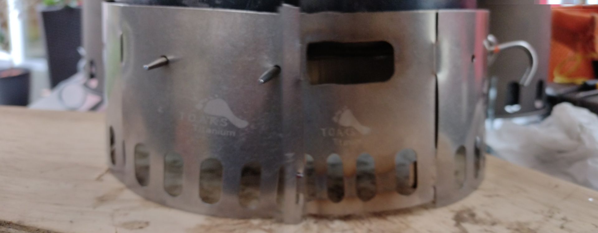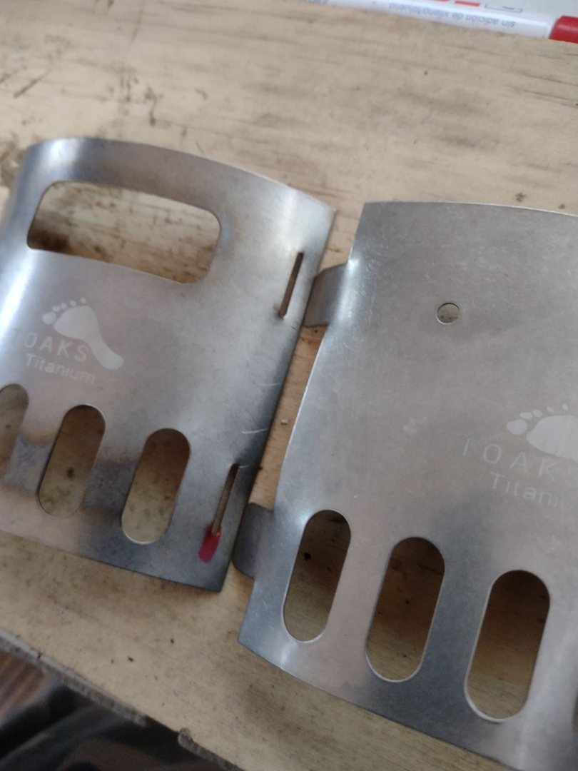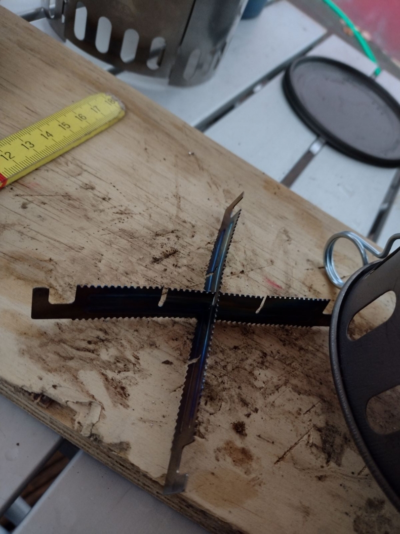 Erster Test mit dem Toaks-Topf und damit das geht halt zwei von den Topfkreuzen drauf. Sonst bekommt die Flamme ja oben gar keine Luft (und es würde sich entweder ersticken, was ich aber eher befürchte so stark erhitzen und dann...).