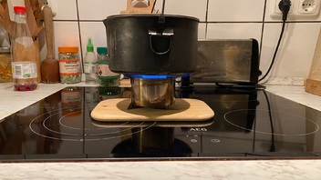 Der zweite Punkt ist, mit dem Windshild kann der Wind nur arg bedingt oben quer kommen. Die Hitze Entwickelung ist sowohl mit dem Topf als auch mit dem Espresso dann wohl besser.