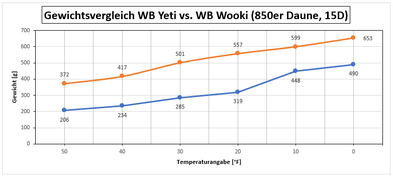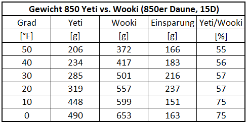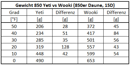 Meine Erkenntnis ist, der Wooki ist bei gleicher Isolationsleistung schwerer als der Yeti ^^. Davon abgesehen wird aber deutlich, dass die Gewichtseinsparung beim 20 °F Yeti im Vergleich zum Wooki am größten ist. Bis 20 °F wiegt der Yeti auch unter 60 % des dem jeweiligen Temperaturbereich zugehörigen Wooki (siehe Tabelle 1).