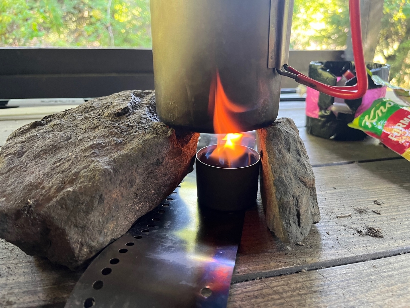 • Ich nutze seit längerem den Toaks Siphon Spiritusbrenner in Verbindung mit einem etwas festeren Titan Windschutz. Den Windschutz habe ich gerollt im Brenner, alles dann in meiner Tasse und dem French Press Pot. Wenig Gewicht und kleines Packmaß. In der Apotheke habe ich mir 100ml Fläschchen für 1 € gekauft die Passen noch mitten in den gerollten Windschutz. Mit 100 ml bekomme ich ca. 4-5 mal Wasser heiß für Kaffee oder Trecking Food (jeweils 350 bis 500 ml). Ich habe auch einen BSR 3000 Titan Gasbrenner für die Schraubkartuschen, den nehme ich aber inzwischen selten. Mit dem Spiritus System habe ich bisher nie Probleme gehabt und es ist geräuschlos. Ich habe zusätzlich immer als Unterlage eine Lötmatte dabei und bisweilen nehme ich meinen Ninja Outdoor Titian Hobo auch als Brenner Windschutz, da er in der Mitte des Kamins optional ein zusätzliches Kreuz für den Brenner hat. Der Abstand zum oberen Rand ist optimal und die Stabilotherm Pfanne steht darauf besser als auf dem klitzekleinen Kreuz direkt auf dem Brenner. Ich kombiniere immer je nach Einsatzzweck und wieviel ich tragen möchte.