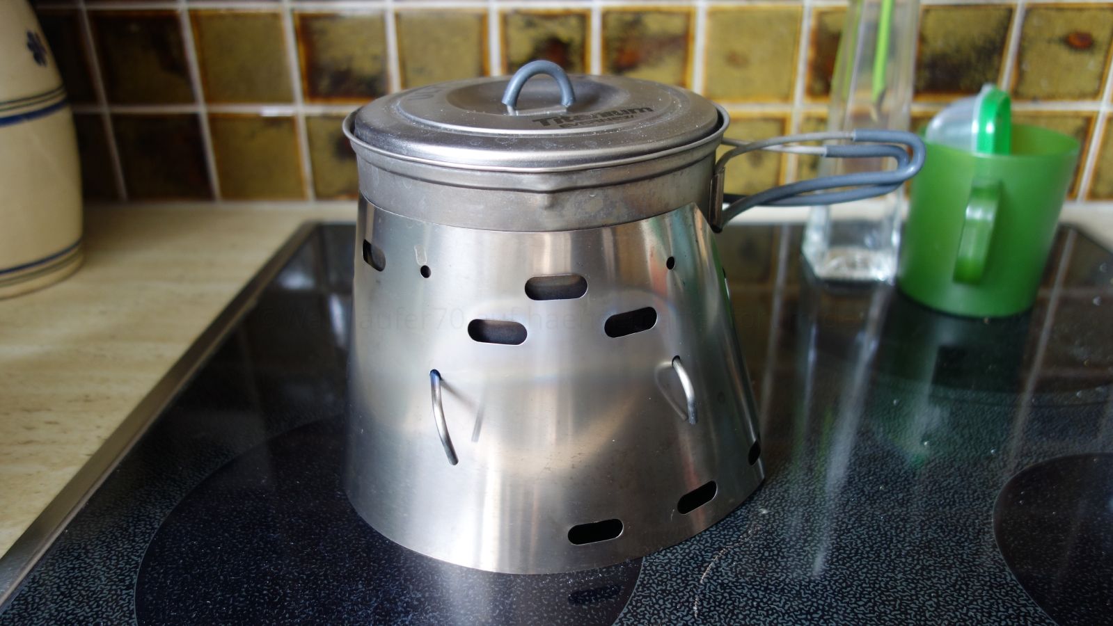 • Topfständer und Windschutz: Sidewinder TiTri aus Titan (TrailDesigns) in einer Tyvek-Hülle (ohne Inferno-Einsatz)