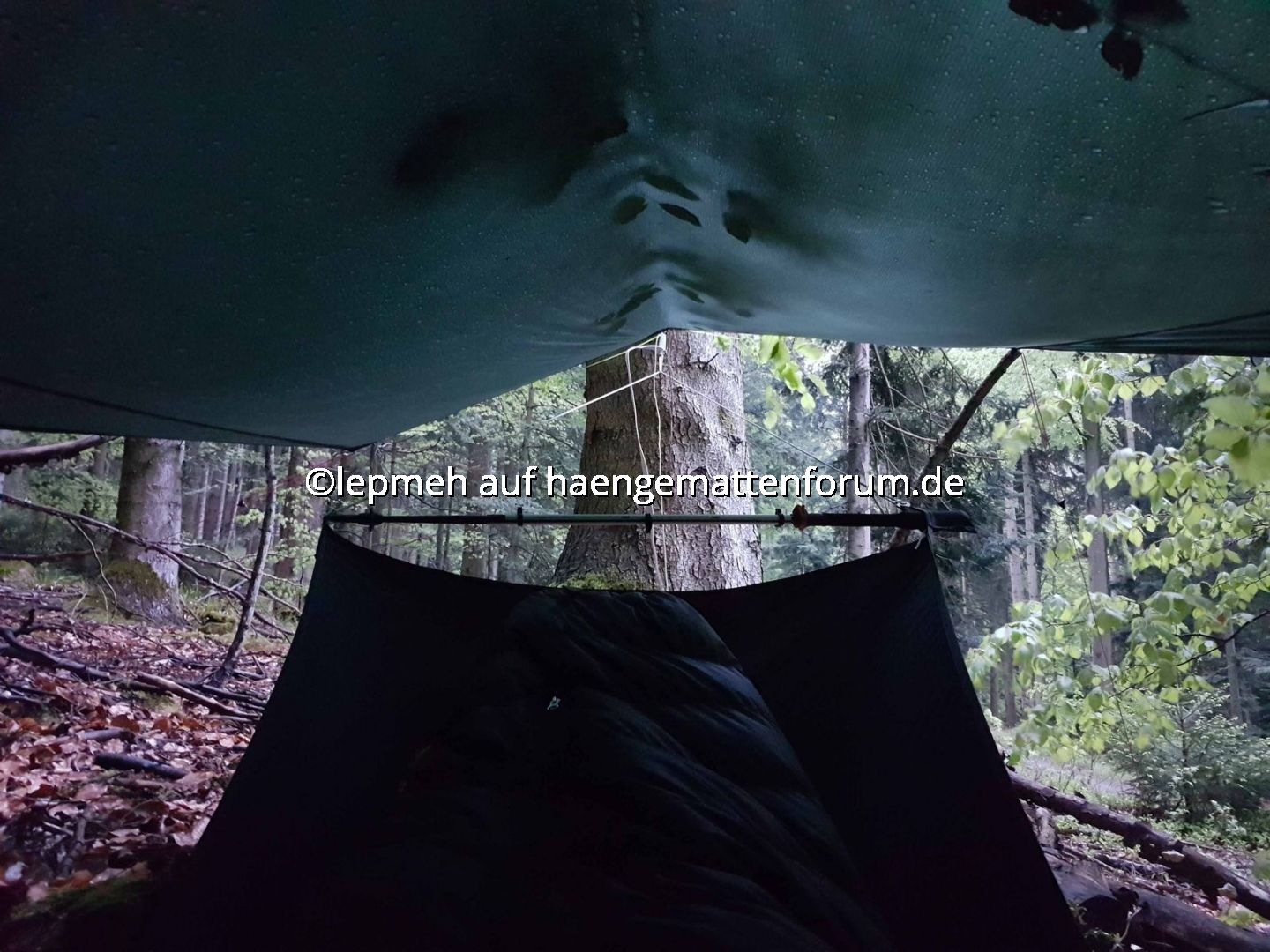 Als Schlechtwetteroption habe ich mein Hilleberg Tarp5 vorgesehen und probeweise mittels regulierbarer, außen liegender Ridgeline angebracht. Einen gemütlichen Landregen überstehe ich damit sicherlich, mit Wind wird‘s bestimmt eng. Als Dripline habe ich mittig perforierte Silikonscheiben zweckentfremdet, Test steht aus.