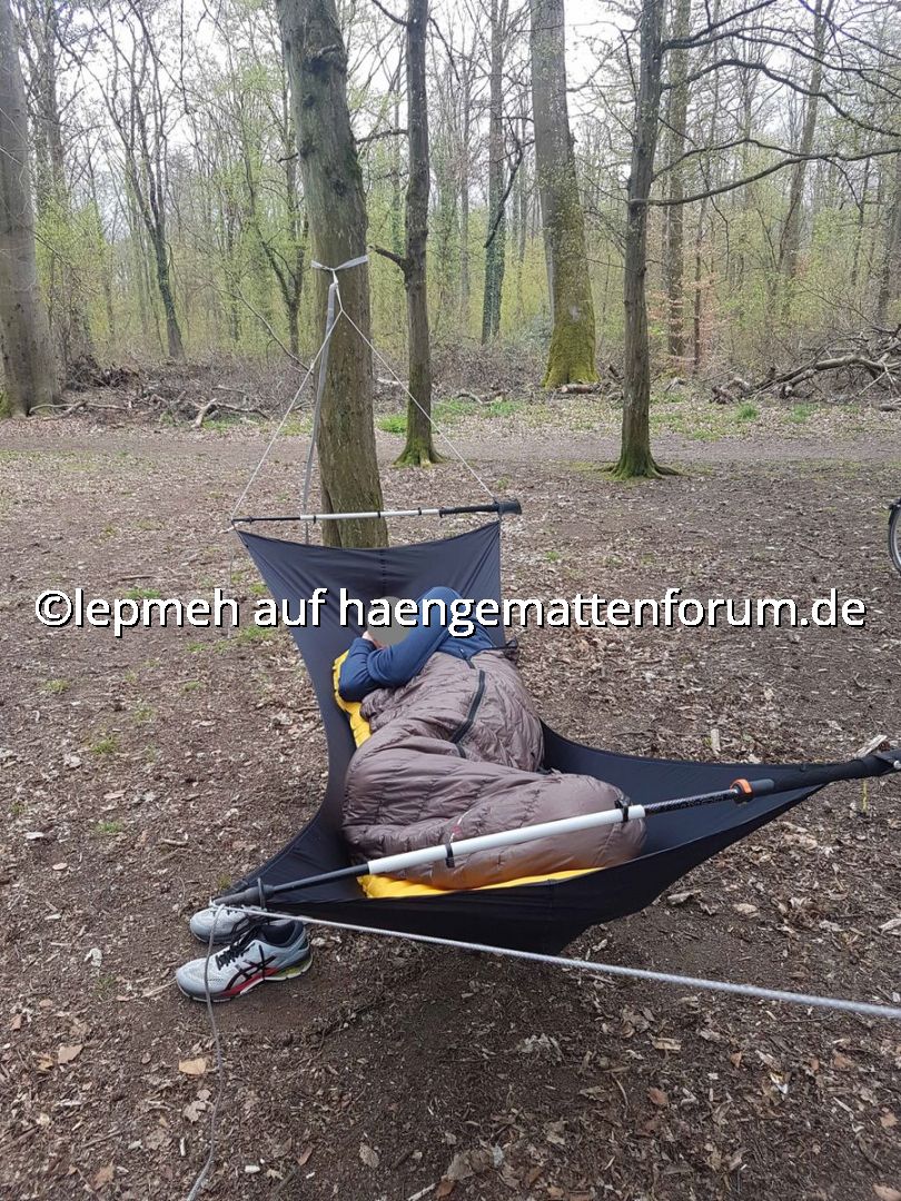Selber nähen, Einstiegsvariante, leicht, klein, als Isolation Schlafsack und Isomatte, Brückenhängematte, Trekkingstöcke als Spreizstäbe, vorerst kein Moskitonetz, Namen geben