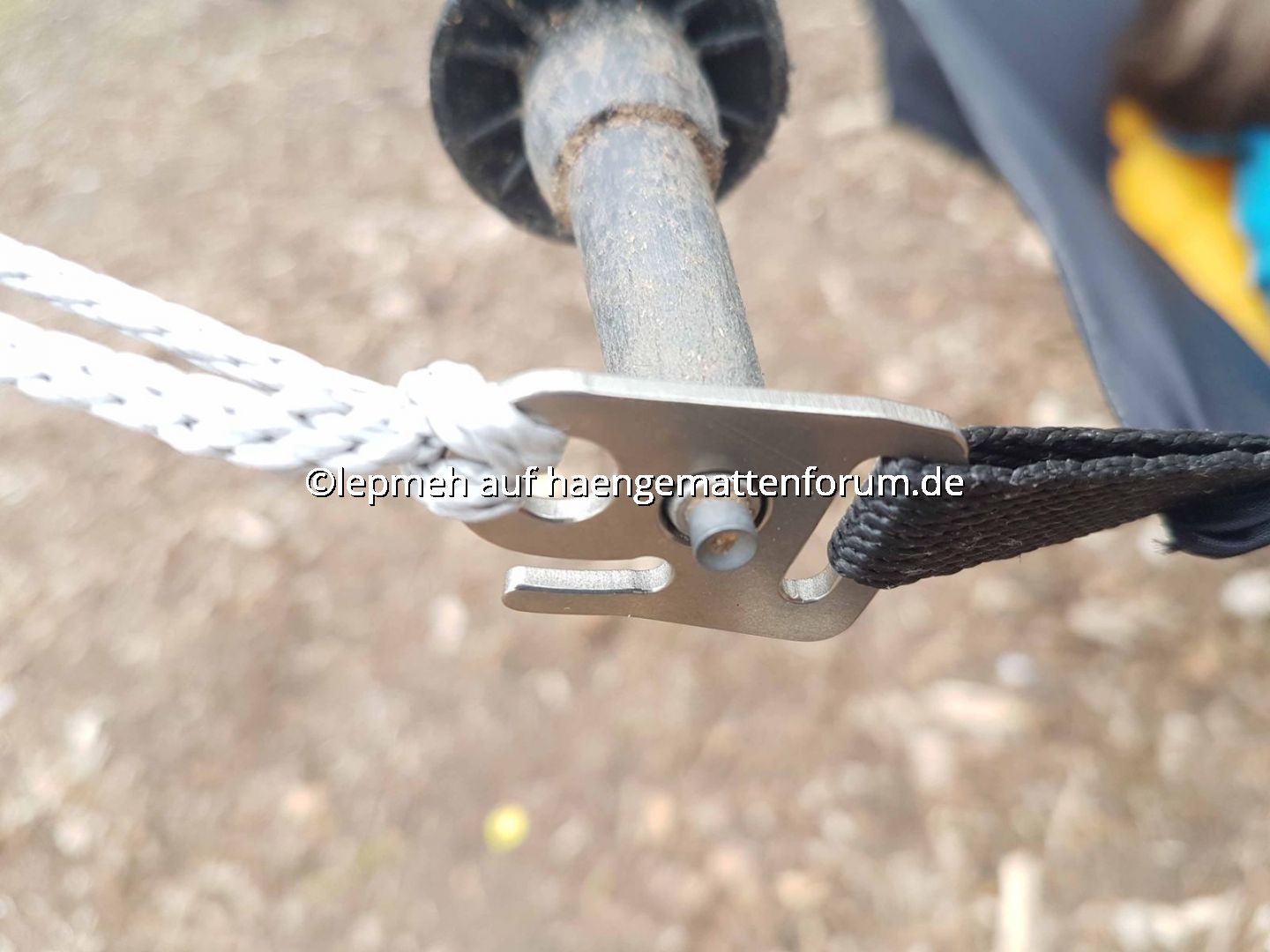 Für die erste Variante des Abspanndreiecks habe ich ein Amsteel Half Bone verwendet, welche auf der Griffseite mittels Lerchenkopfknoten, auf der Titanendstückseite variabel mittels Kuhstek befestigt war. Angefangen habe ich, bei einer Stocklänge von 90cm, mit einer Schenkellänge von 135cm, bin nun durch rumprobieren und abwägen aber bei 100cm gelandet und habe den Half Bone durch mit einen 200cm Amsteel Dog Bone ersetzt.