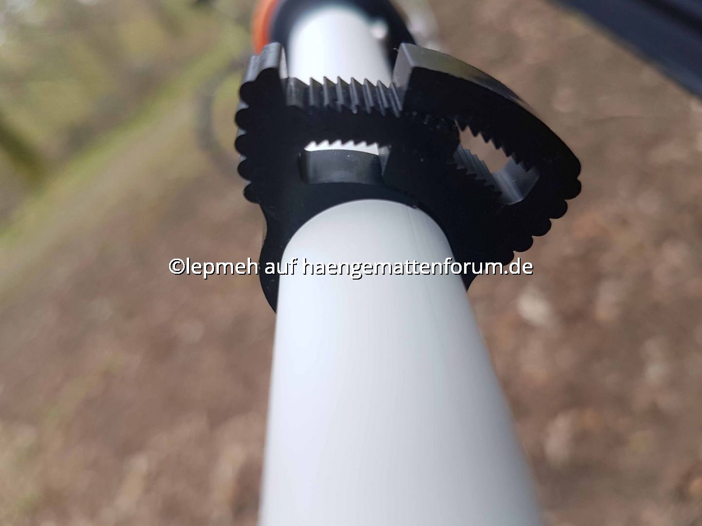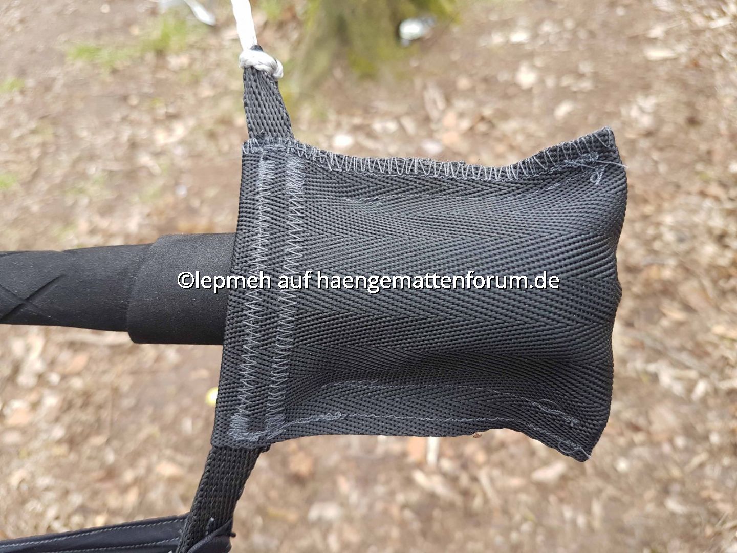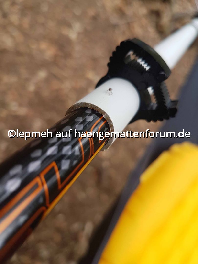 Meine Trekkingstöcke (faltbare Leki-Alustöcke mit demontierten Griffen und aus Gewichtsgründen ersatzweise angebrachten Duplon-Angelrutengriffen) verstärke ich im Spreizstabmodus durch je ein 50cm langes Stück Quick-Pipe, welches ich durch drei Herbie-Clips reversibel fixiere. Ob, und wenn ja wieviel zusätzliche Bruchsicherheit das bringt, keine Ahnung, aber die testweise provozierte Durchbiegung erscheint geringer und in jedem Fall beruhigt es. Das Griffende des Trekkingstocks sitzt in einer Tasche aus Sicherheitsgurt, das spitze Ende in einem Titanendstück für Brückenhängematten.