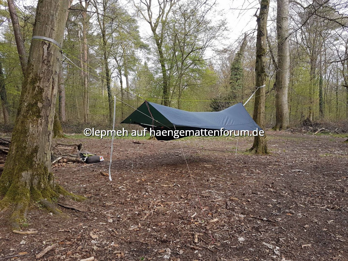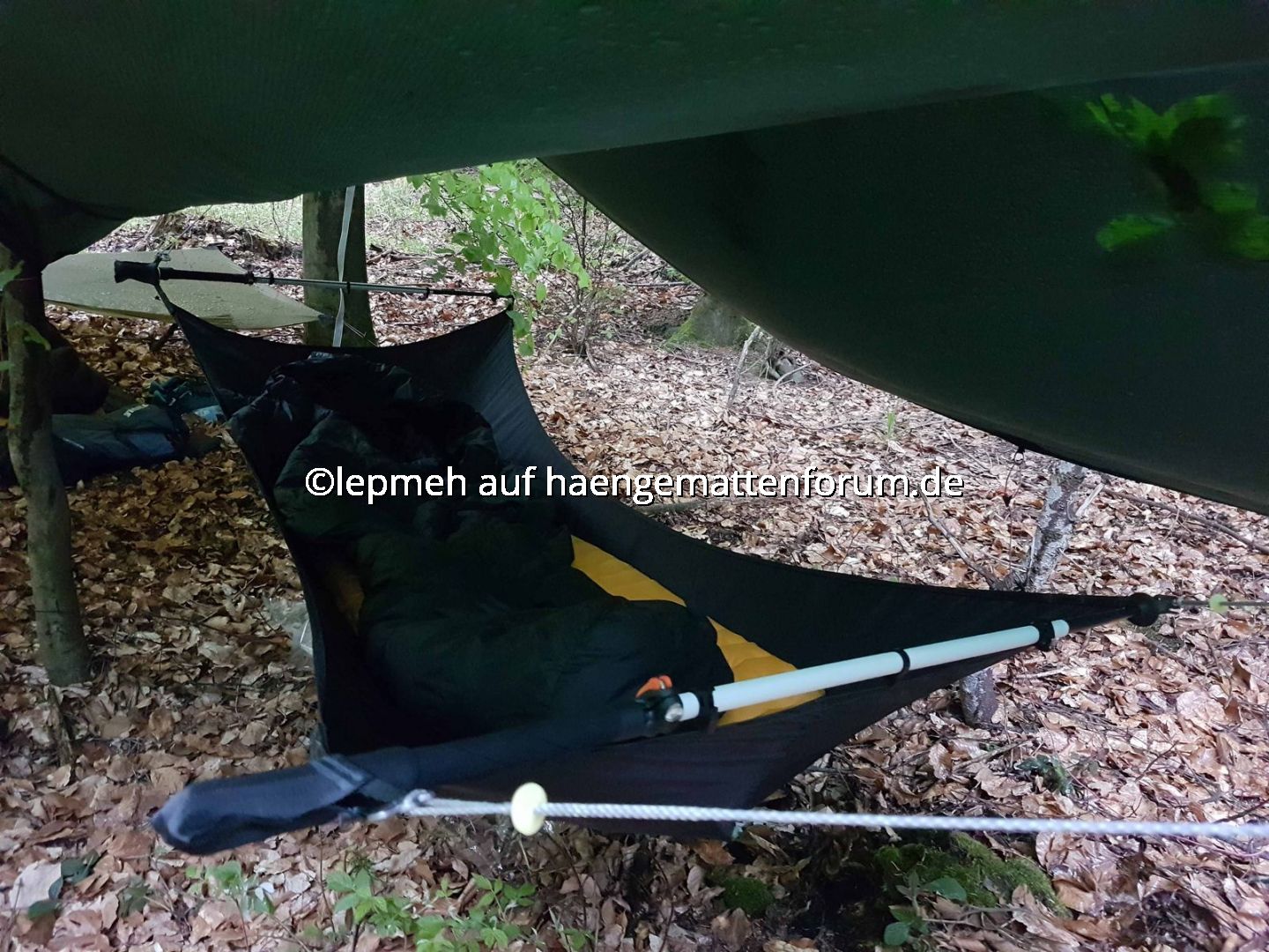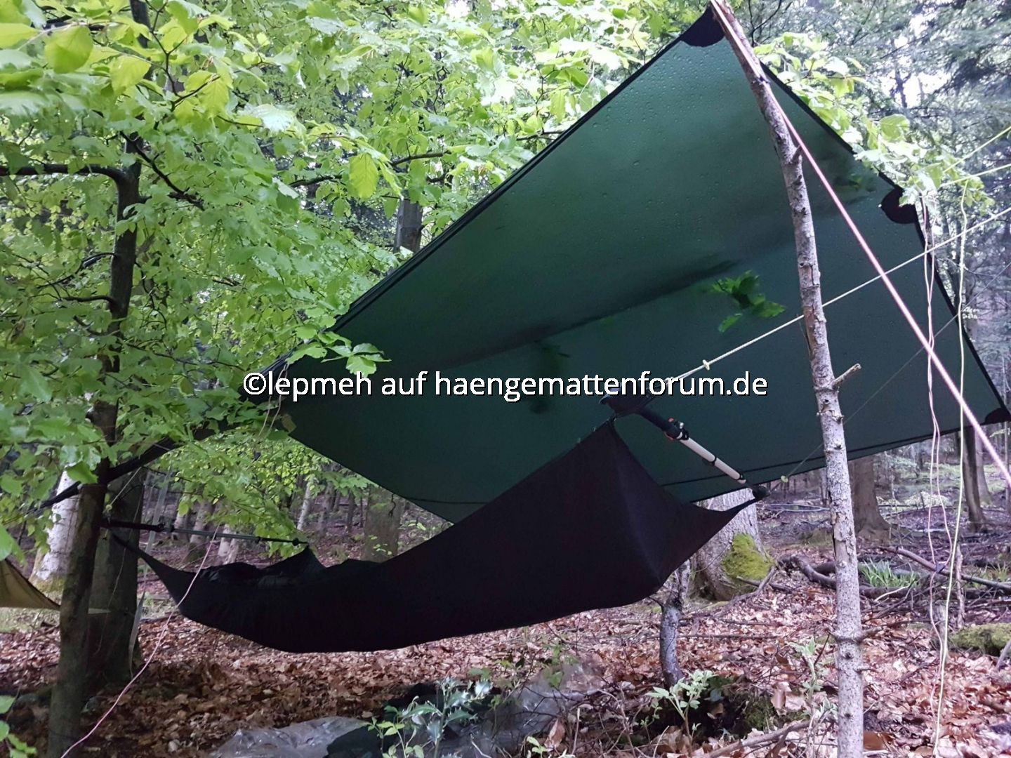 Als Schlechtwetteroption habe ich mein Hilleberg Tarp5 vorgesehen und probeweise mittels regulierbarer, außen liegender Ridgeline angebracht. Einen gemütlichen Landregen überstehe ich damit sicherlich, mit Wind wird‘s bestimmt eng. Als Dripline habe ich mittig perforierte Silikonscheiben zweckentfremdet, Test steht aus.