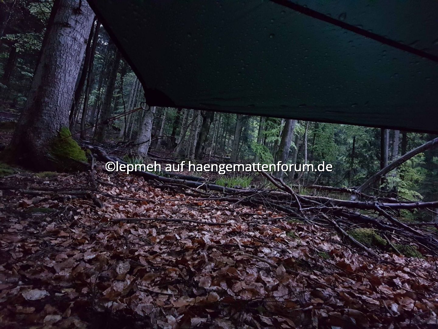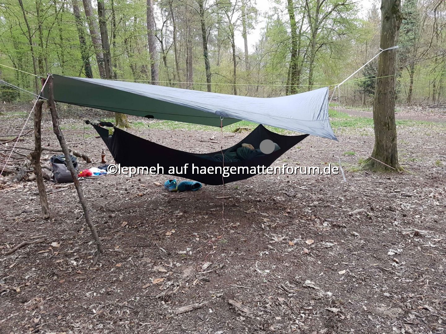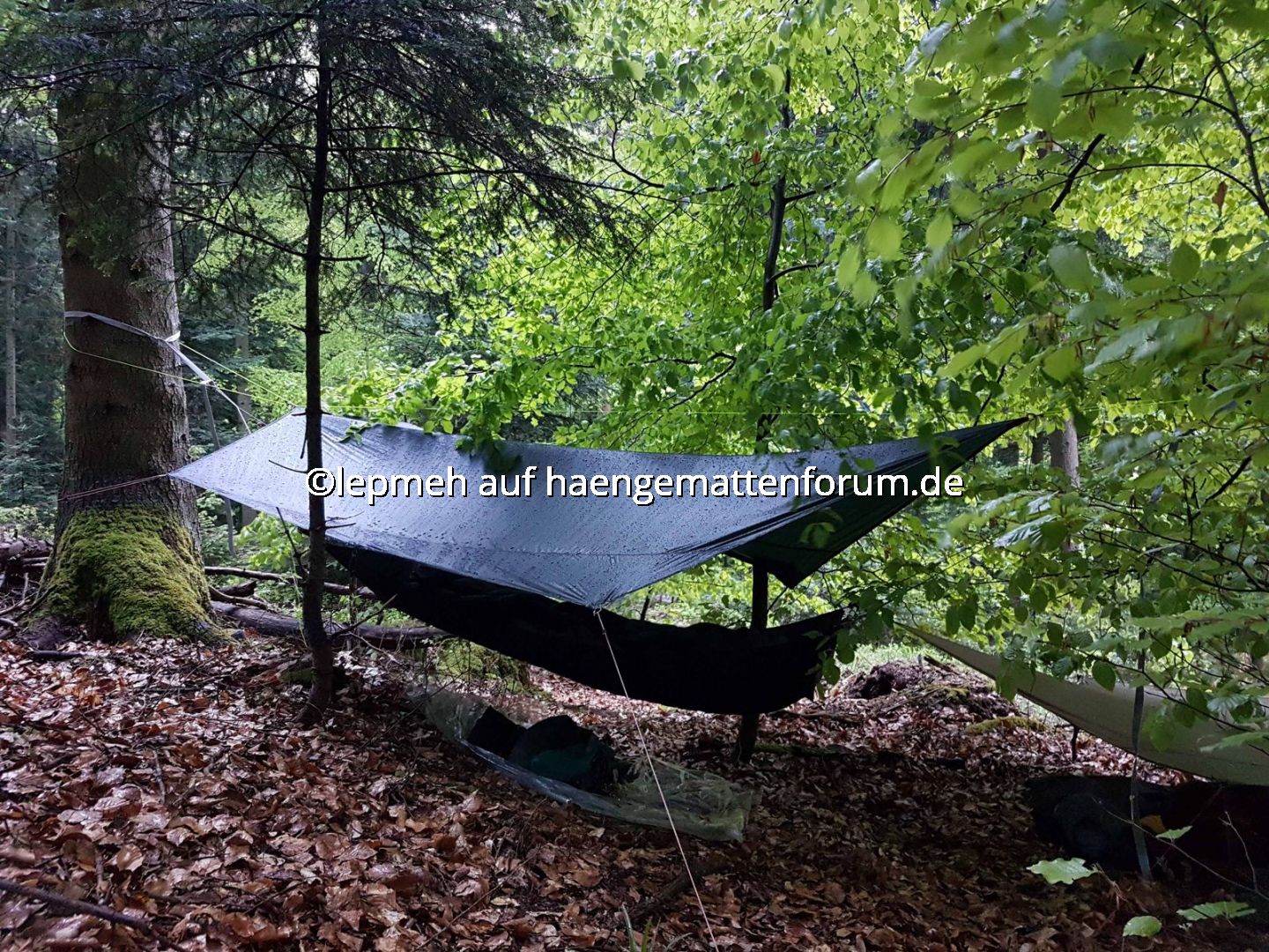 Als Schlechtwetteroption habe ich mein Hilleberg Tarp5 vorgesehen und probeweise mittels regulierbarer, außen liegender Ridgeline angebracht. Einen gemütlichen Landregen überstehe ich damit sicherlich, mit Wind wird‘s bestimmt eng. Als Dripline habe ich mittig perforierte Silikonscheiben zweckentfremdet, Test steht aus.