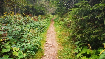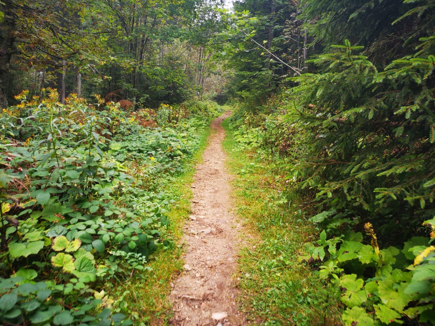 jetzt überwiegend bergab und langsam breitere Forstwege, aber schöne Morgenstimmung. Weiß jemand, was das ist? Ich bin nicht so botanisch bewandert.