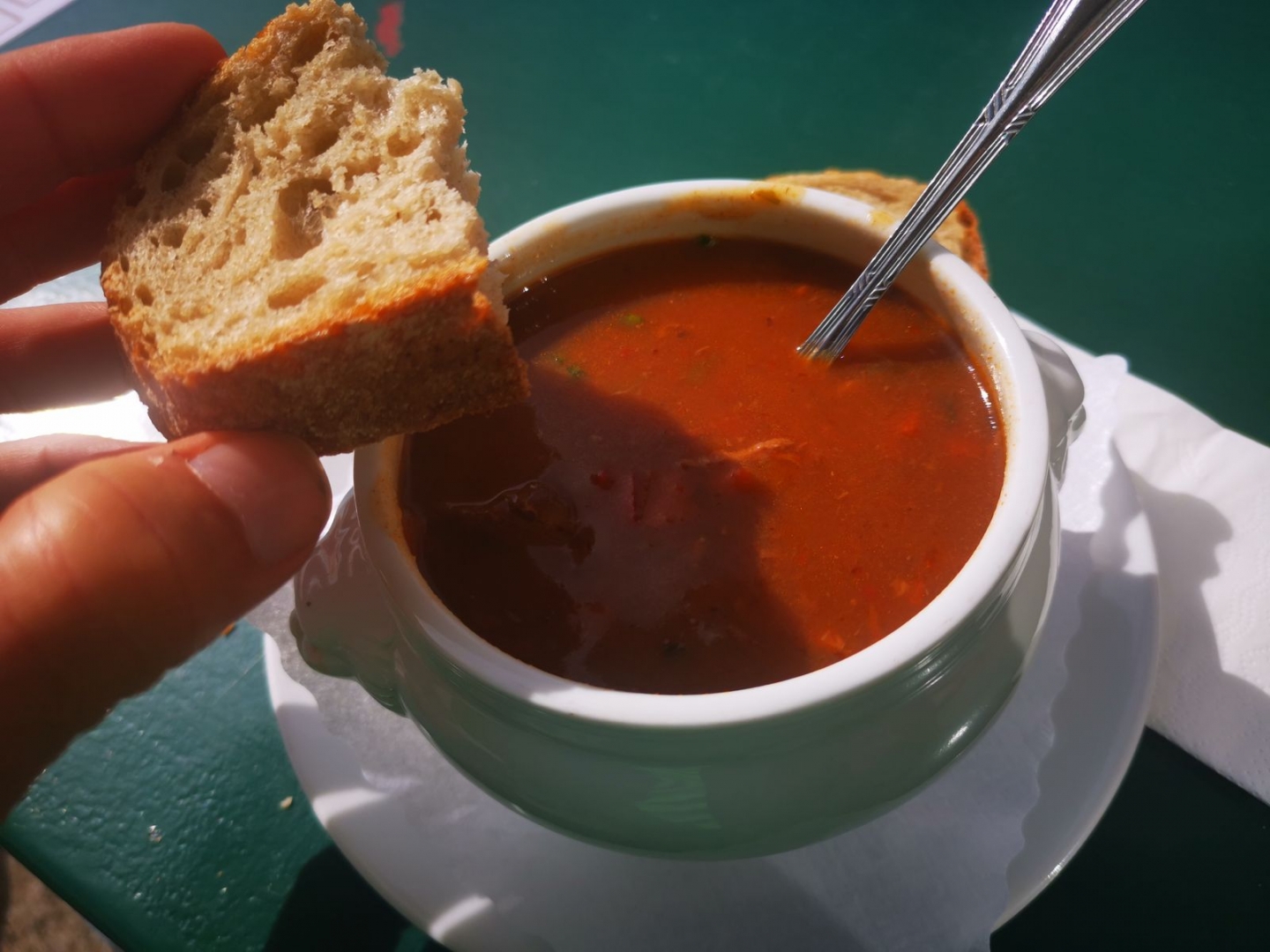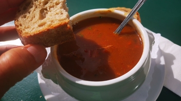 Am nächsten Tag war es kalt und windig. Aber wir sind an allen drei Tagen wie durch ein Wunder immer dem Regen ausgewichen. Und als es dann an diesem Kiosk beim Gasthof Brend Schnitzel mit Pommes, Salat und Soße gab, da mussten wir nicht überlegen. Ich glaube, das fällt unter Glamping und hat hervorragend geschmeckt. Kann ich nur empfehlen, war weit über Kioskniveau.