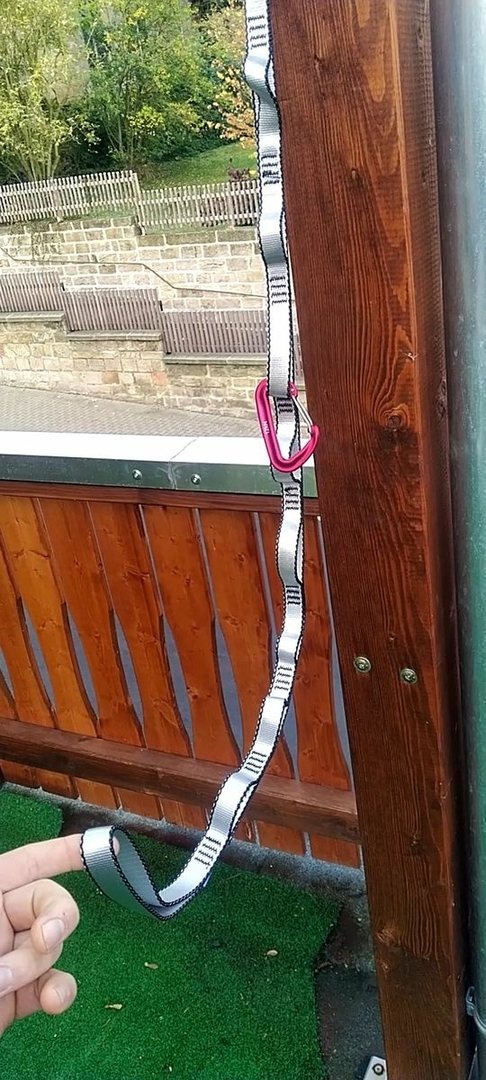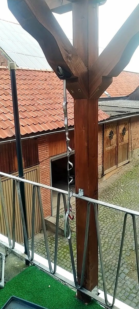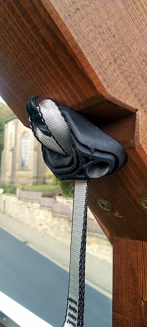 Werden mit 3 Schrauben befestigt. In der letzten Wohnung unterm Dach direkt in Balken geschraubt und hier auf meiner Terrasse habe ich mit Baumgurten um die Balken erst ermittelt wie ich am besten hänge und dann die Halter mit langen Schrauben festgemacht. Auf Amz bin ich dann auf diese Daisy Chain gestoßen , halten laut Beschreibung 23kn.