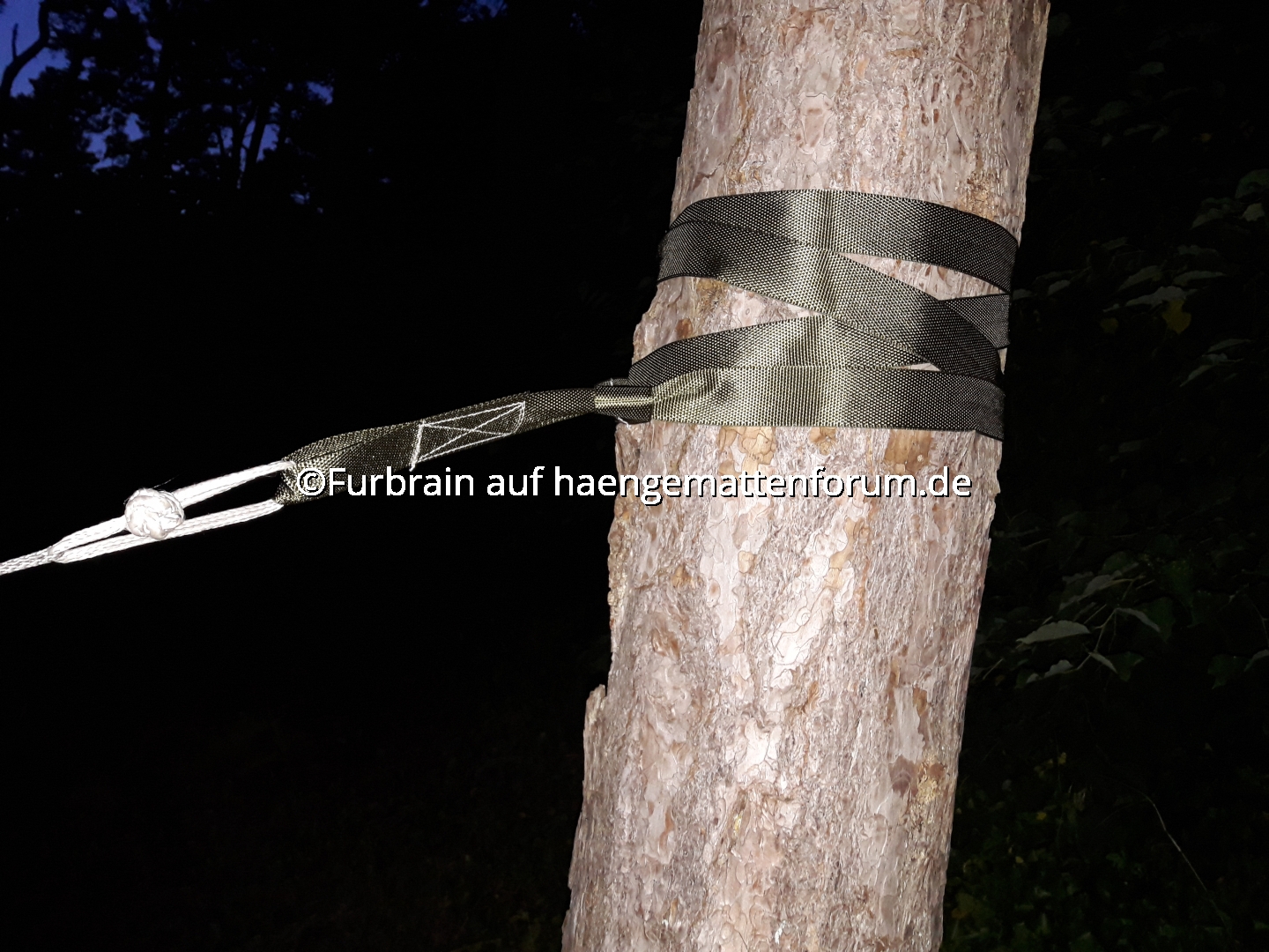 Sie soll einen festen Platz bekommen. Gurte und Polsterung können ruhig (zumindest den Sommer über) am Baum verbleiben. Die Hängematte selbst möchten wir mit einer schnellen Lösung (Karabiner oder geeigneter Knoten) ab und anhängen können.