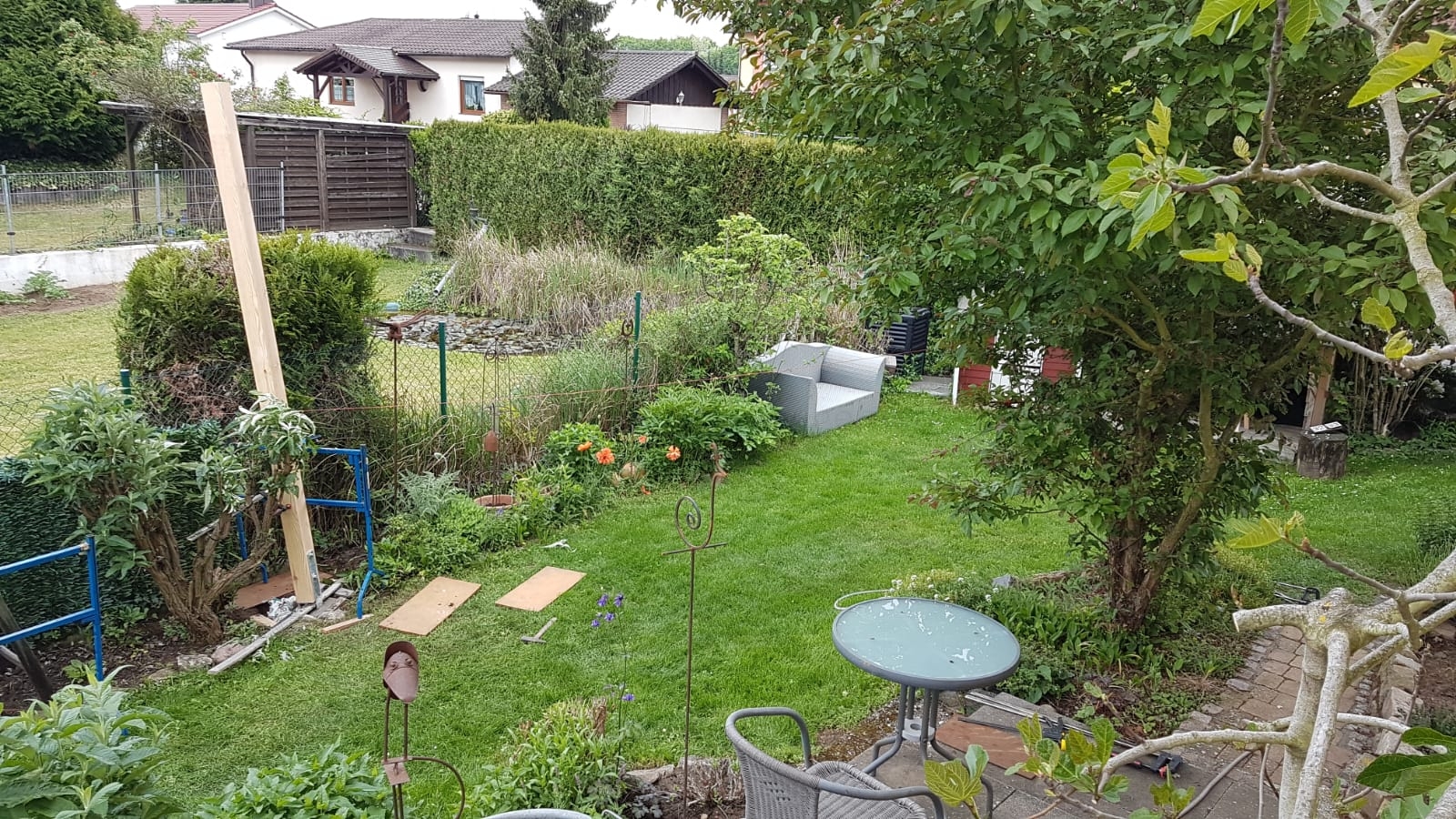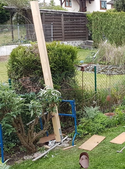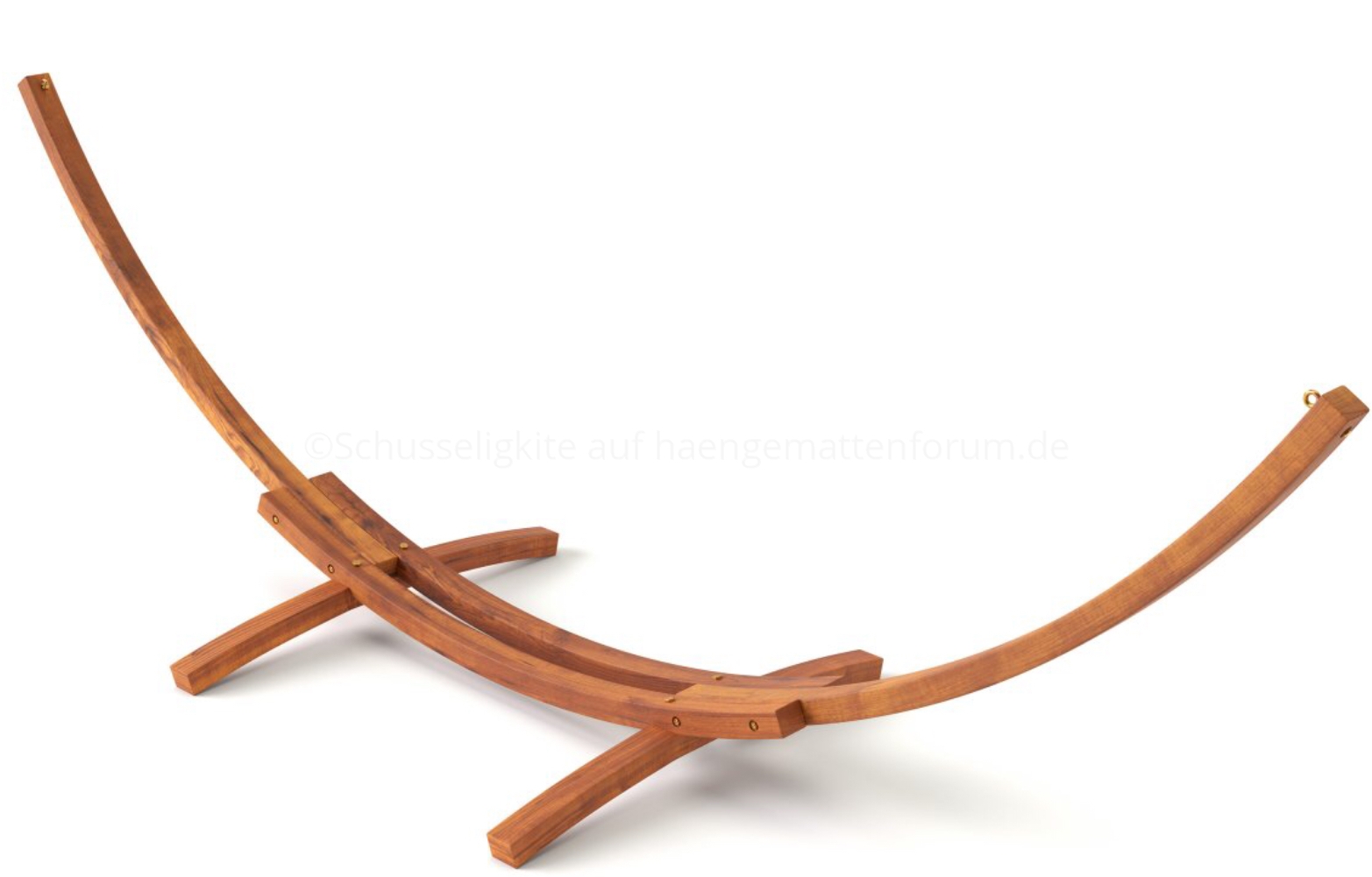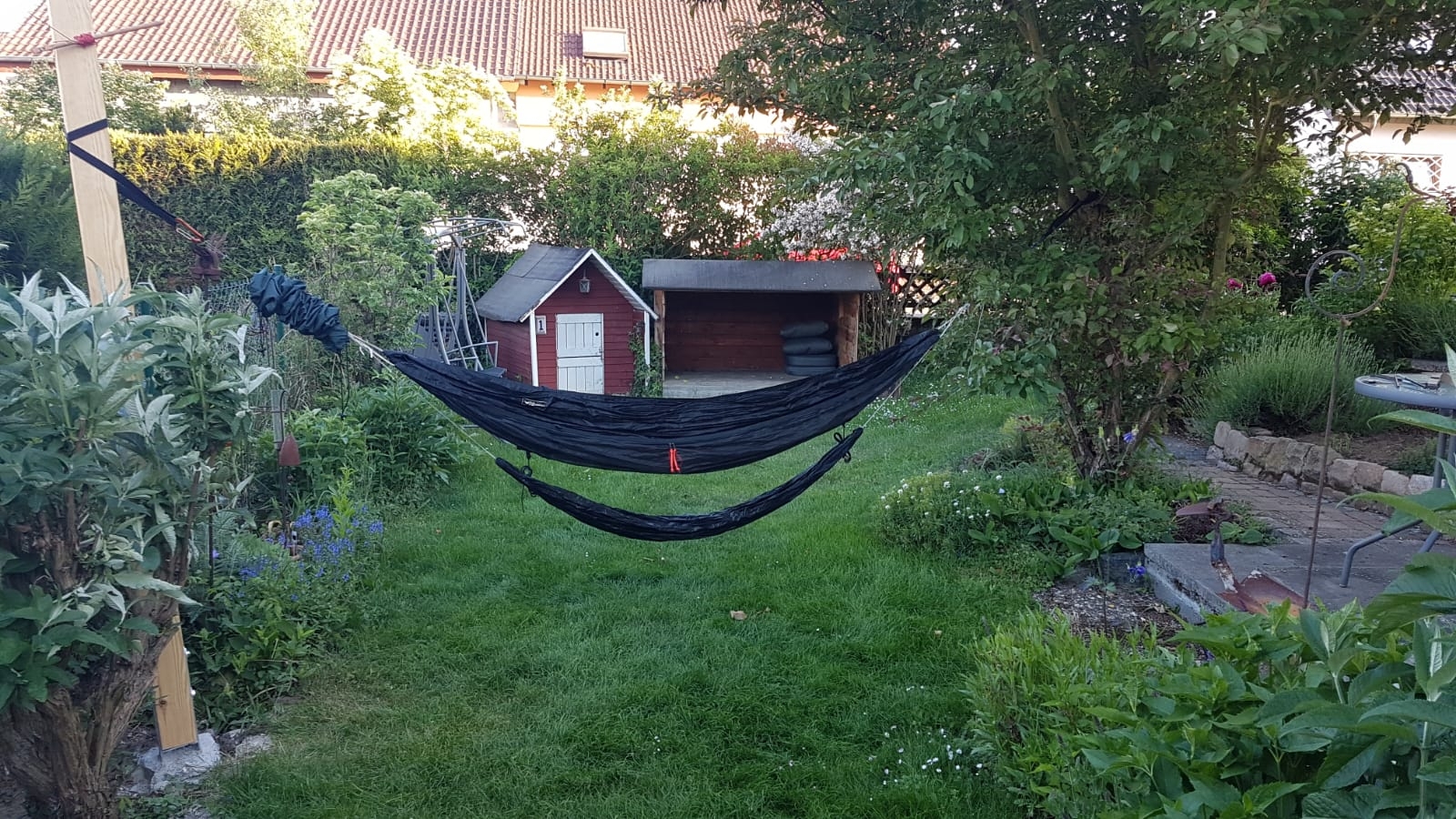 Für dich richtige Hängematte funktioniert das Ding aber nicht. Also klar kann ich die Matte da reinhängen. Aber die Aufhängepunkte sind auf etwa einem Meter Höhe und damit passt es vom Winkel her nicht. Also, glaube ich zumindest.
