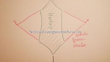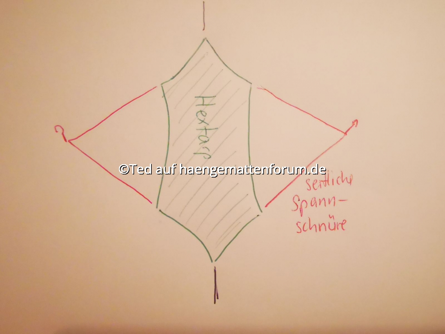 Kann man sowas eigentlich auch mit einem Hextarp machen? So wie auf dem Bild angezeichnet. Dass sozusagen zwei Abspannschnüre an einem Punkt zusammenlaufen?